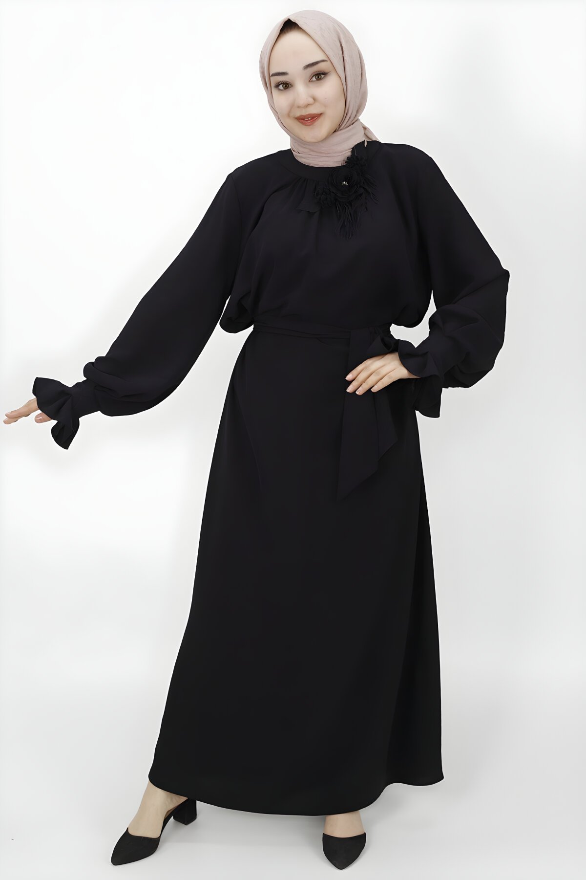 ButikÇiçek Aksesuar Detaylı Balon Kol Siyah Tesettür Elbise