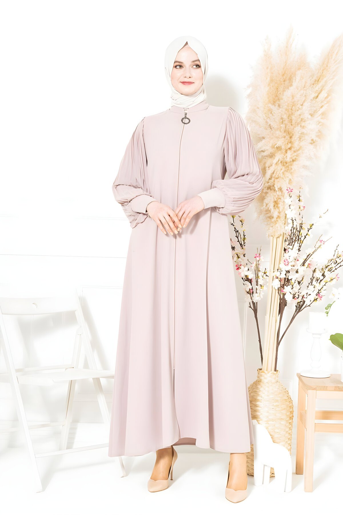 Modern tesettür giyimin önde gelen parçalarından olan bej fermuarlı pilise detaylı ferace, hem şıklığı hem de rahatlığı bir arada sunuyor. Beyza markasının özenle tasarladığı bu parça, Devr-i Tesettür kalitesiyle sizlerle buluşuyor. Günlük ve özel kullanıma uygun zarif bir seçimdir.