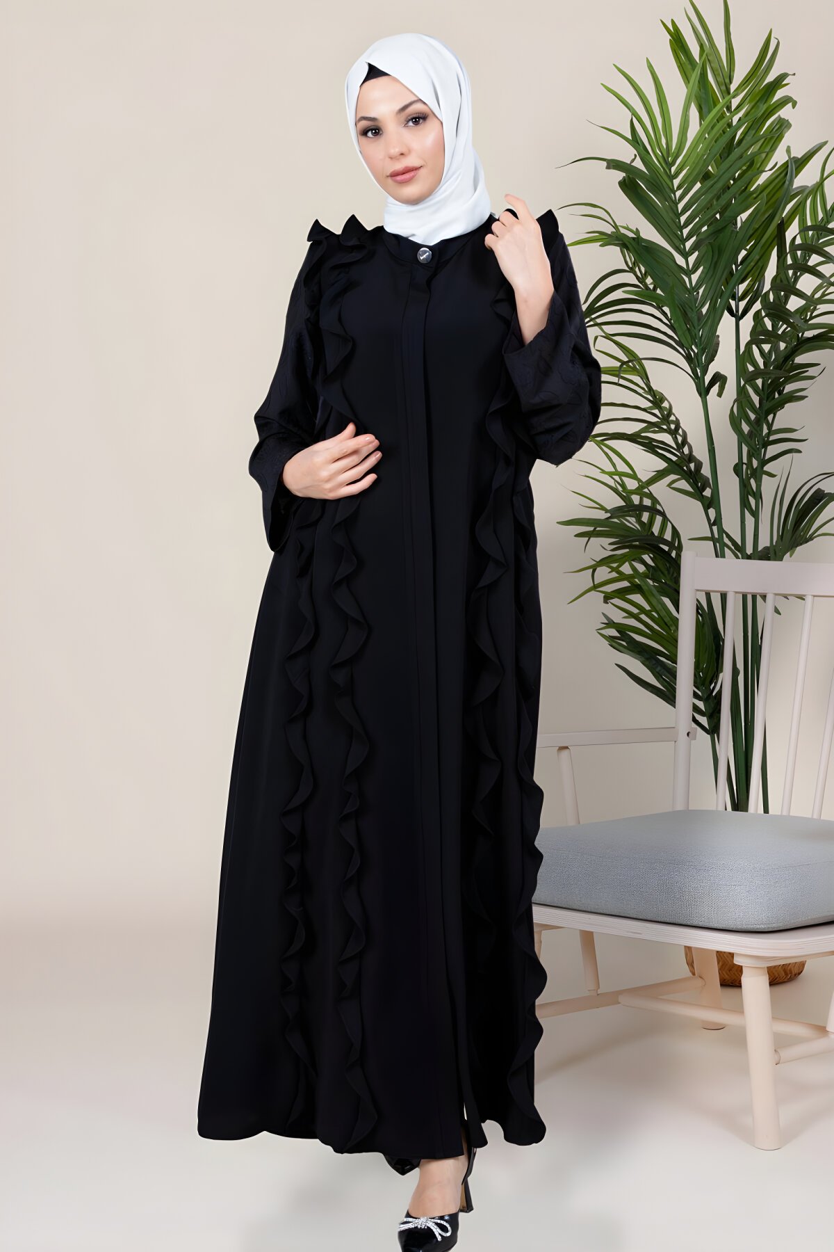 BeyzaSiyah İdil Kolları Dantel ve Volan Detaylı Ferace