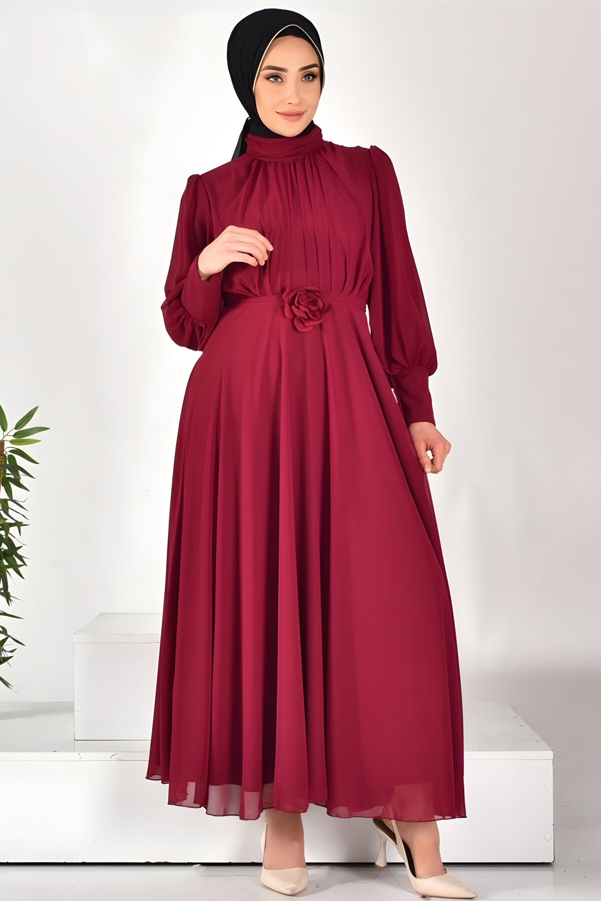 PuaneMor Renk Şifon Kumaş Pileli Tesettür Abiye Elbise
