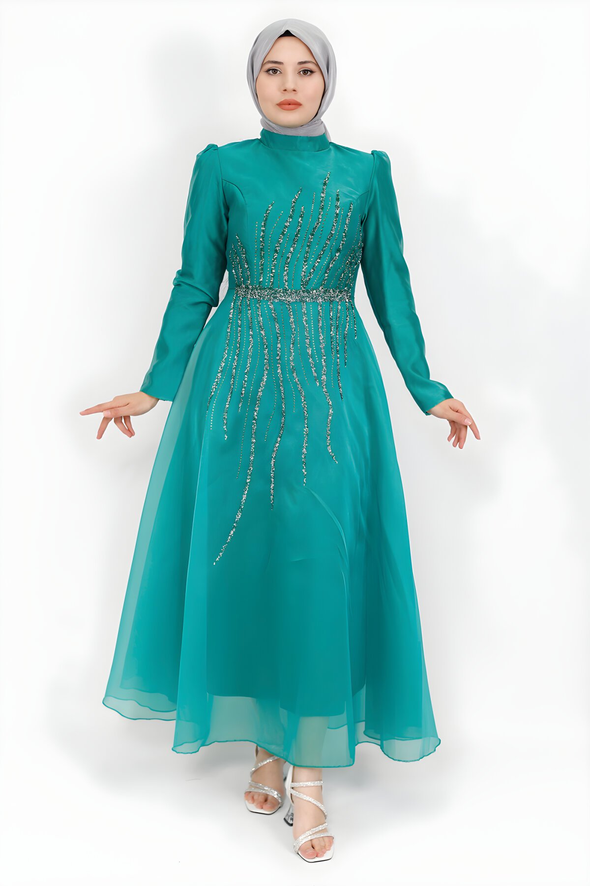 Bycoolest Butik Önü Taş Detaylı Yeşil Tül Kumaş Tesettür Abiye Elbise