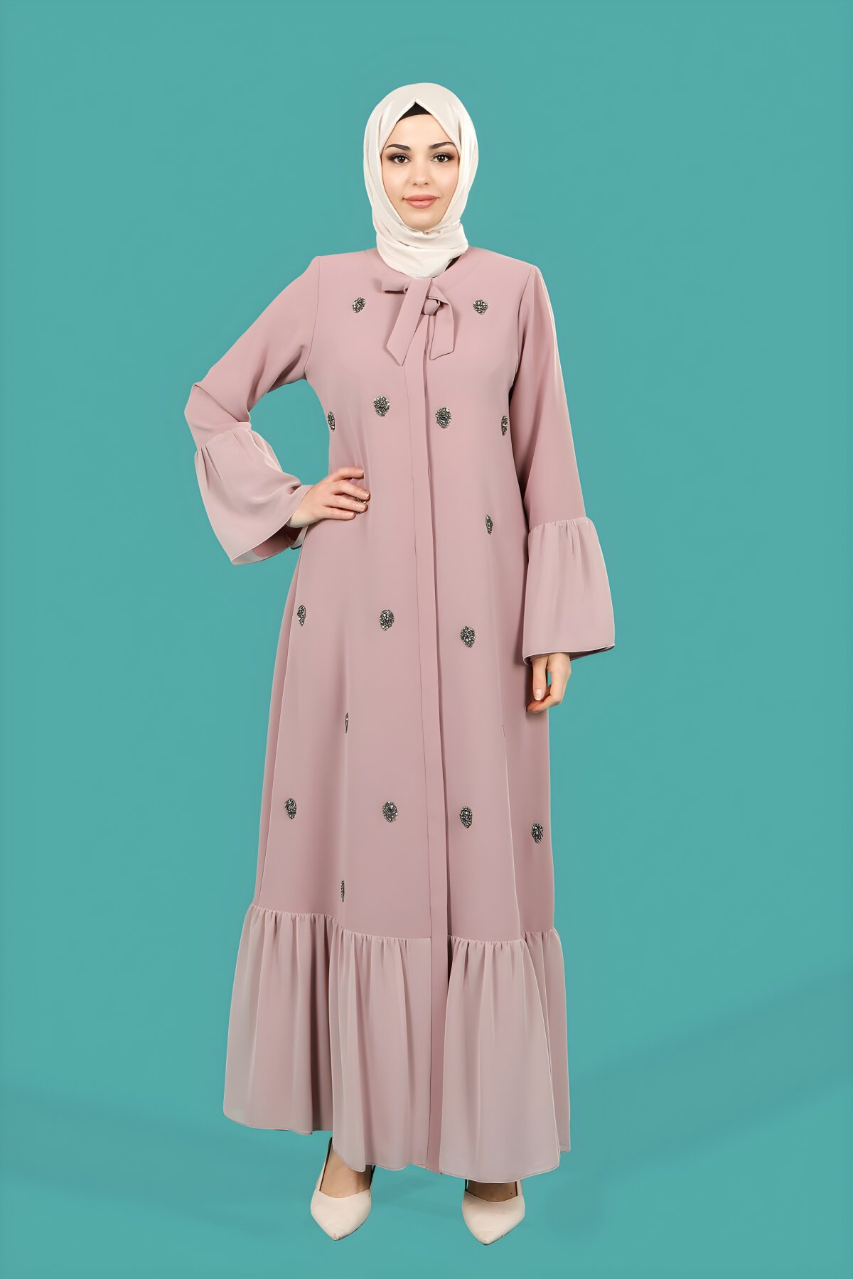 Beyza imzalı, gri renkteki bu şifon detaylı ferace, tesettür giyimde şıklığı ve rahatlığı birleştiriyor. Yakası bağlamalı detayı ve pembe taş işlemeleri ile dikkat çeken bu özel tasarım, Devr-i Tesettür kalitesiyle özel günleriniz için modern bir görünüm sunar.