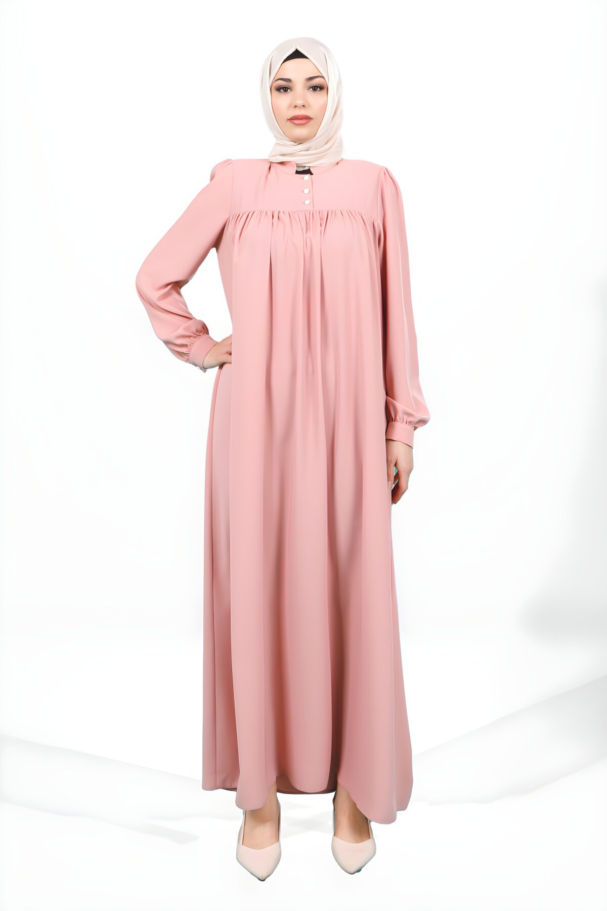 Beyza Pembe Robadan Kesim Düğmeli Manşetli Tesettür Elbise