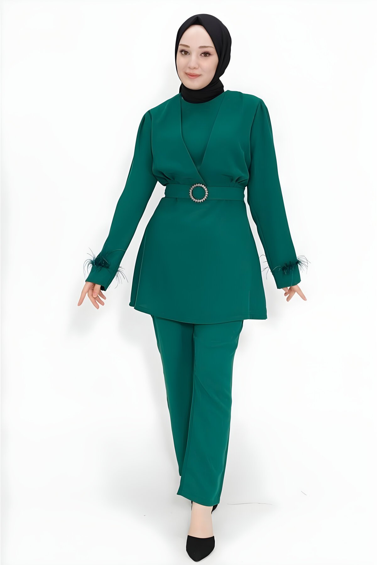 Bycoolest ButikYeşil Kemeri Taşlı Krep Kumaş İkili Tesettür Takım