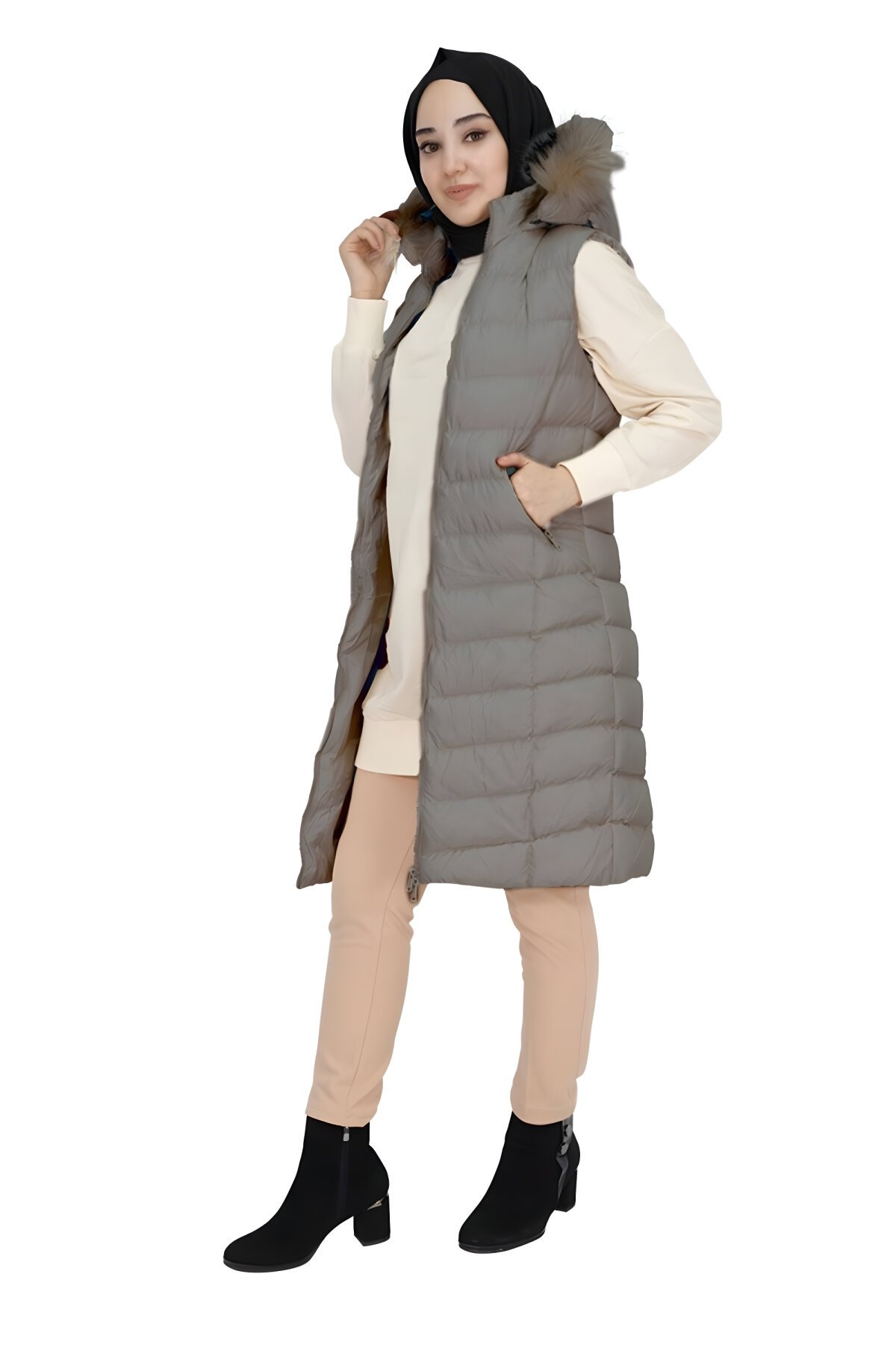 Bycoolest ButikGri Rengi, Cep Fermuarlı Dolum Şişme Tesettür Yelek