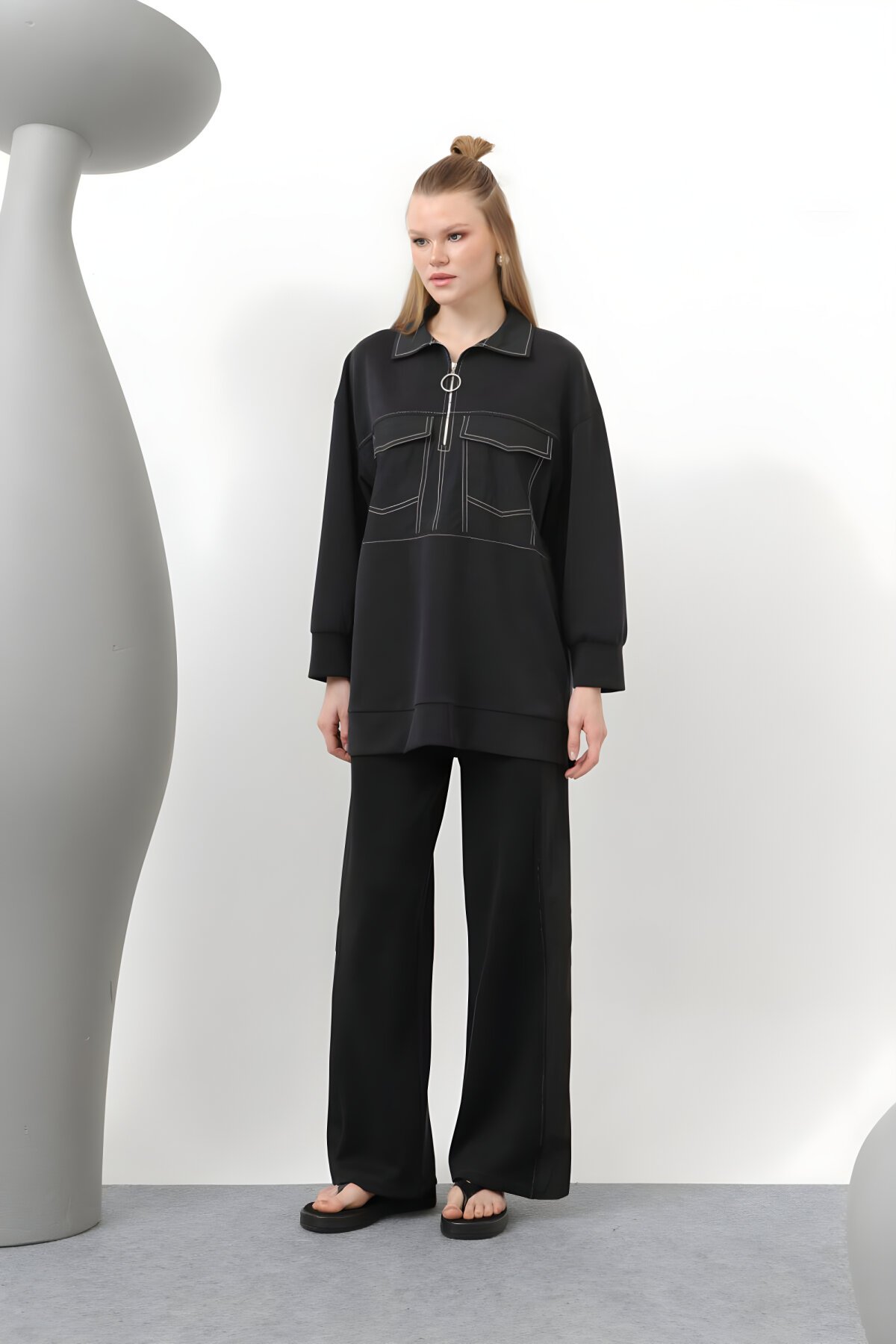 PuaneSiyah Modal Kumaş Özellikli Cep Detaylı Tesettür Takım