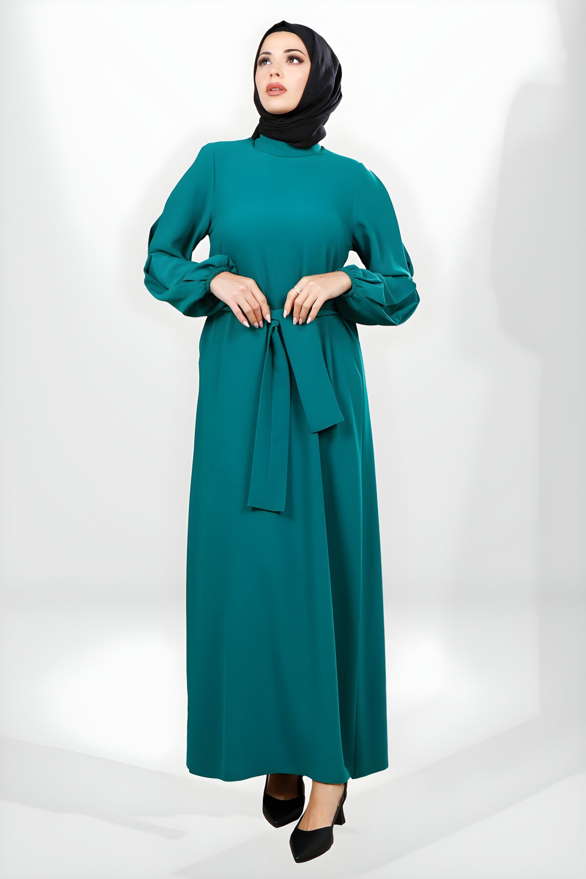 BeyzaKuşaklı Pilikaşe Kol Detaylı Yeşil Tesettür Elbise