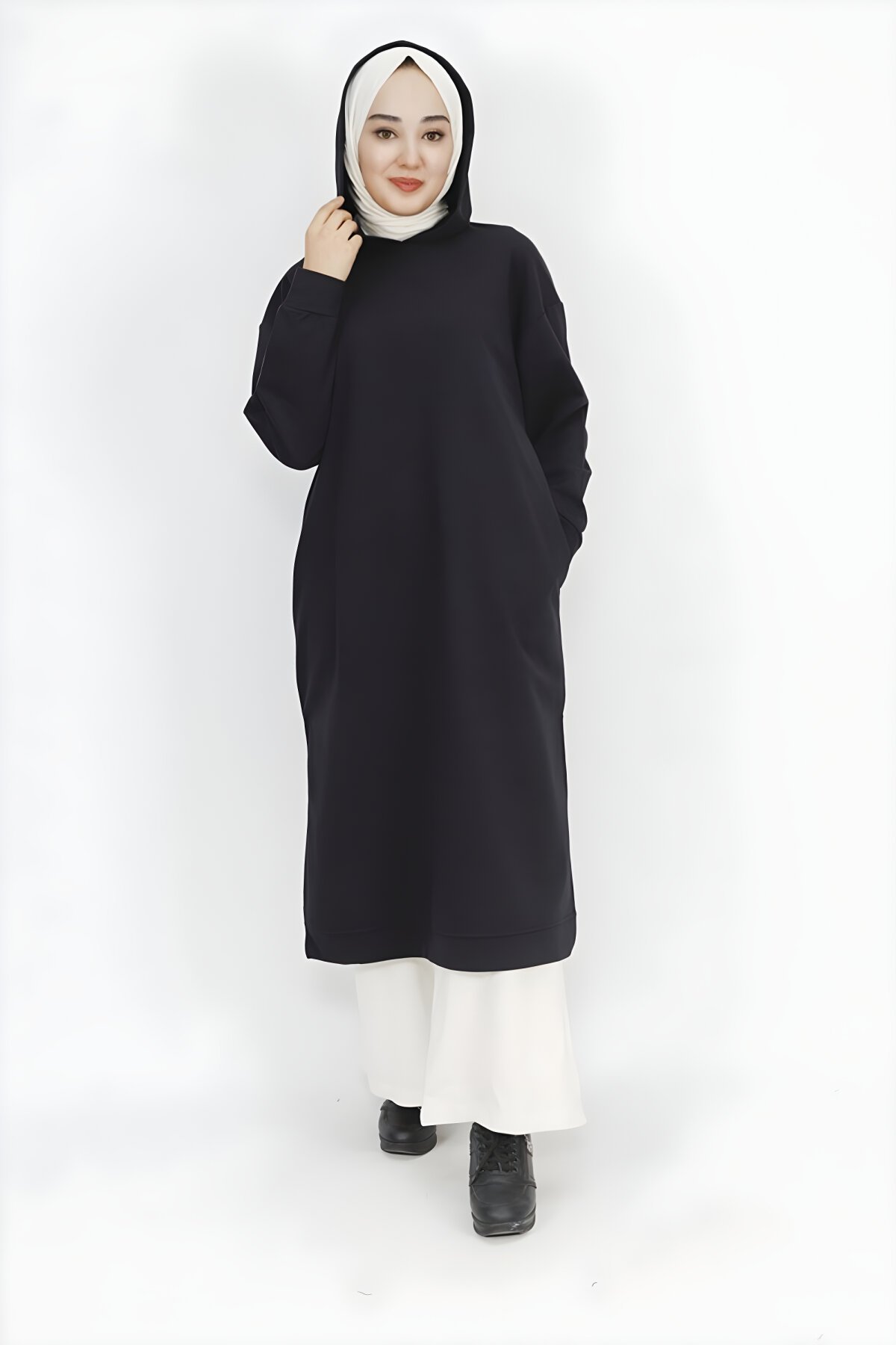 ButikSiyah İp Kumaş Kapüşonlu Yırtmaç Detaylı Tesettür Tunik