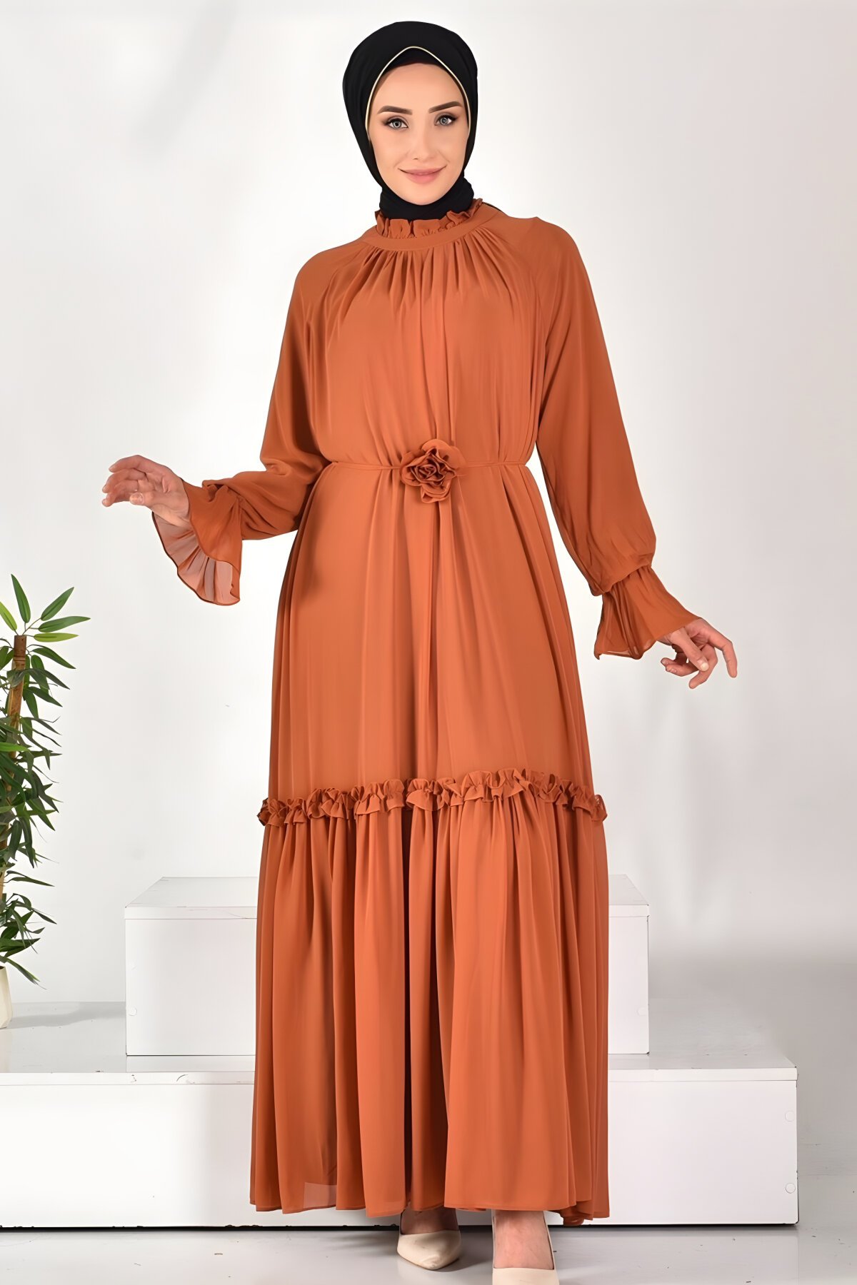 Puane markasının Kiremit Şifon Kumaş Kol Detaylı Tesettür Elbise modeli ile şıklığı yakalayın. Özgün kol detayı ve akıcı şifon kumaşı sayesinde hem rahat hem de modern bir görünüm sunar. Yüzlerce seçkin tesettür giyim ürününe Devr-i Tesettür güvencesiyle kolayca ulaşın.