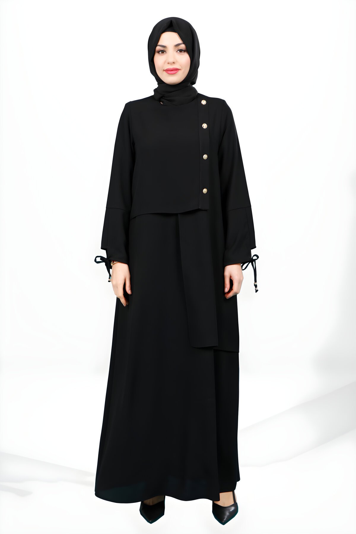 BeyzaKolu Bağlamalı Düğme Detaylı Siyah Tesettür Elbise