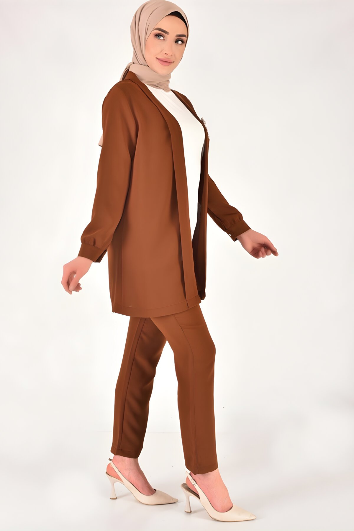 Bycoolest ButikTaş Aksesuar Detaylı Kahverengi Krep Kumaş Üçlü Tesettür Takım