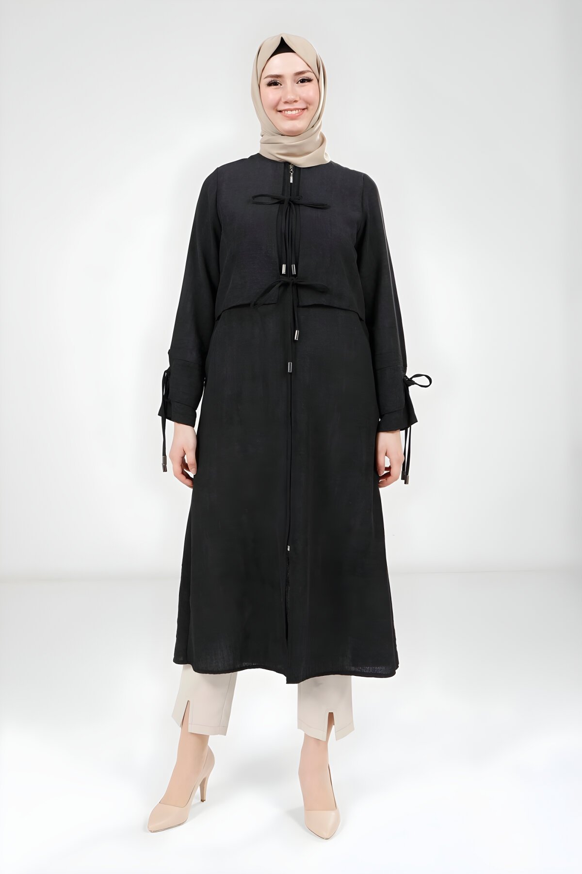 Beyza markasının sunduğu bu siyah düğüm detaylı giy çık kap, modest giyim anlayışınıza yeni bir soluk getiriyor. Rahat ve şık bir görünüm sunan bu modern parçayı hem günlük hayatınızda hem de özel anlarınızda kolayca kullanabilirsiniz. Tüm tesettür kap, pardesü ve giy çık modellerini Devr-i Tesettür farkıyla hemen inceleyin.