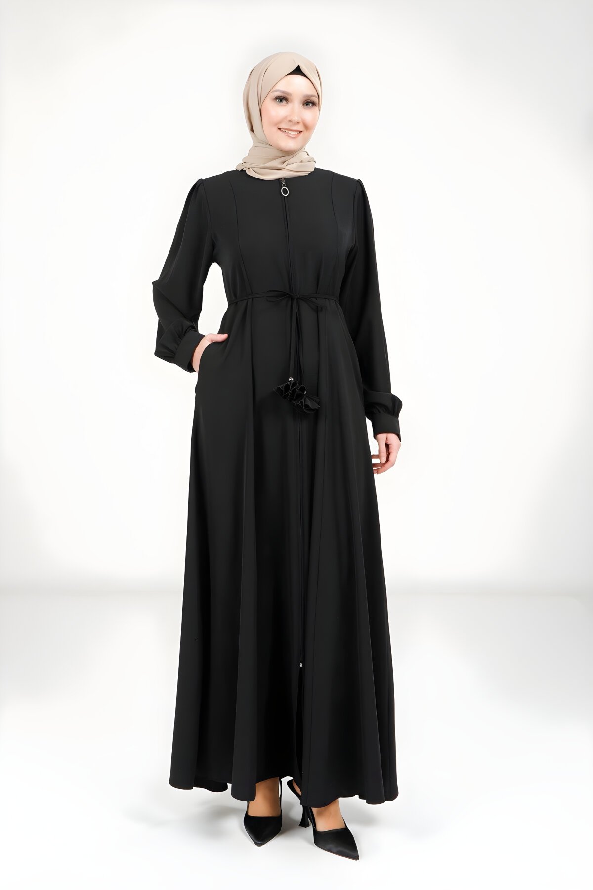 BeyzaFermuarlı ve Bağlama Detaylı Siyah Ferace