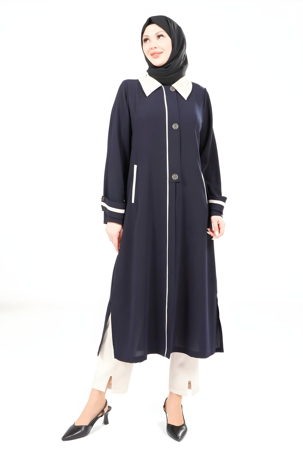 Beyza markasına ait bu şık Lacivert Yakalı Giy Çık modeli, günlük ve özel günleriniz için ideal bir tesettür giyim ürünüdür. Uzun ve rahat kalıbıyla dikkat çeken bu parça, tesettür kap ve pardesü modelleri arasında konfor arayanların tercihi olacak. En yeni Beyza ürünlerini Devr-i Tesettür güvencesiyle keşfedin.