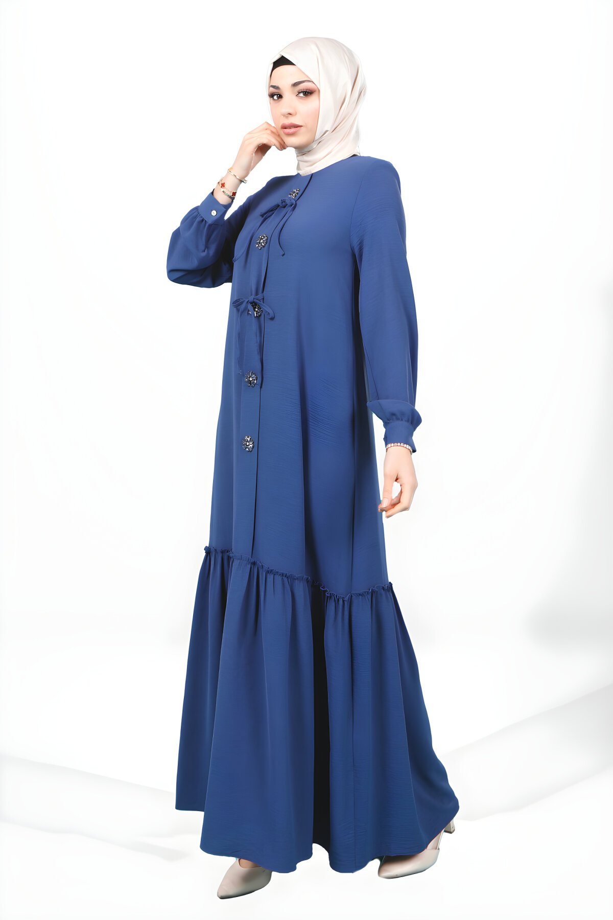 Beyza markasına ait İndigo renkli bu tesettür elbise, şıklığı ve rahatlığı bir arada sunuyor. Önden fiyonk, çiçek detayları ve büzgülü etek kesimi ile dikkat çeken bu model, günlük ve özel anlarınız için ideal. Devr-i Tesettür güvencesiyle hemen keşfedin.