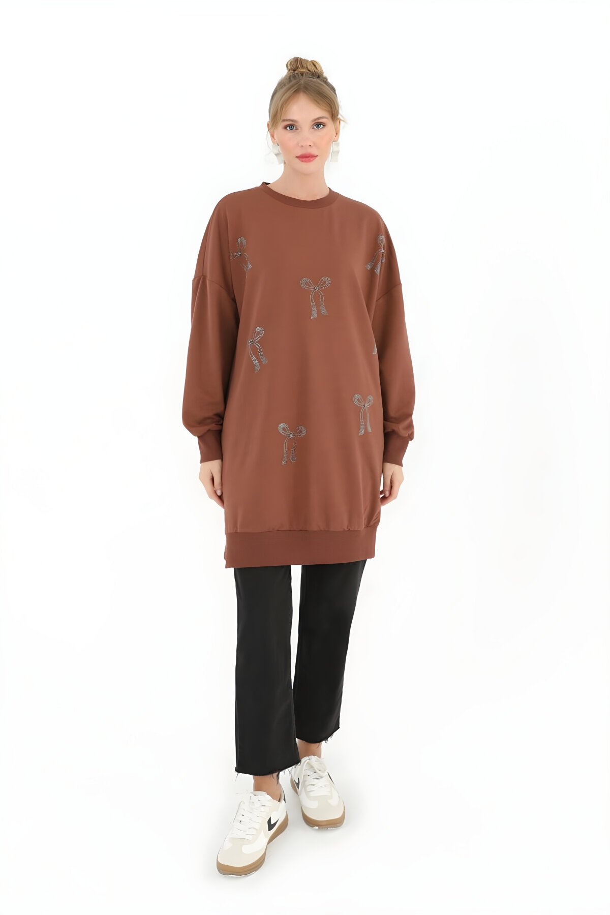 PuaneTaş Baskılı Kahve İki İplik Kumaş Tesettür Tunik