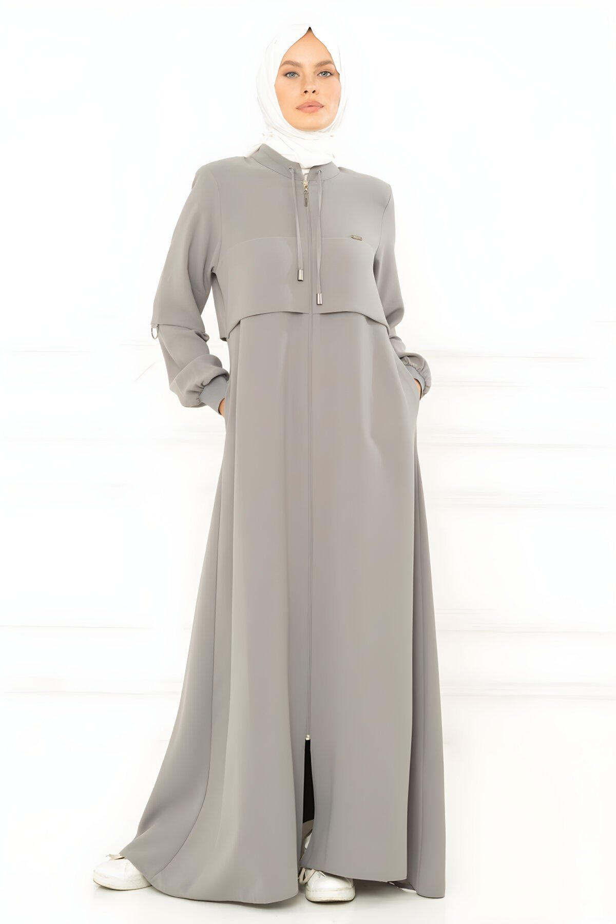 Astarsız, fermuarlı, yaka bağcıklı, ribana kol manşetli spor gri ferace. Esnek yapısı ile kırışmaya dayanıklı, iç göstermez, terletmez, nefes alan ve ağırlık yapmayan kumaş özelliğine sahiptir.