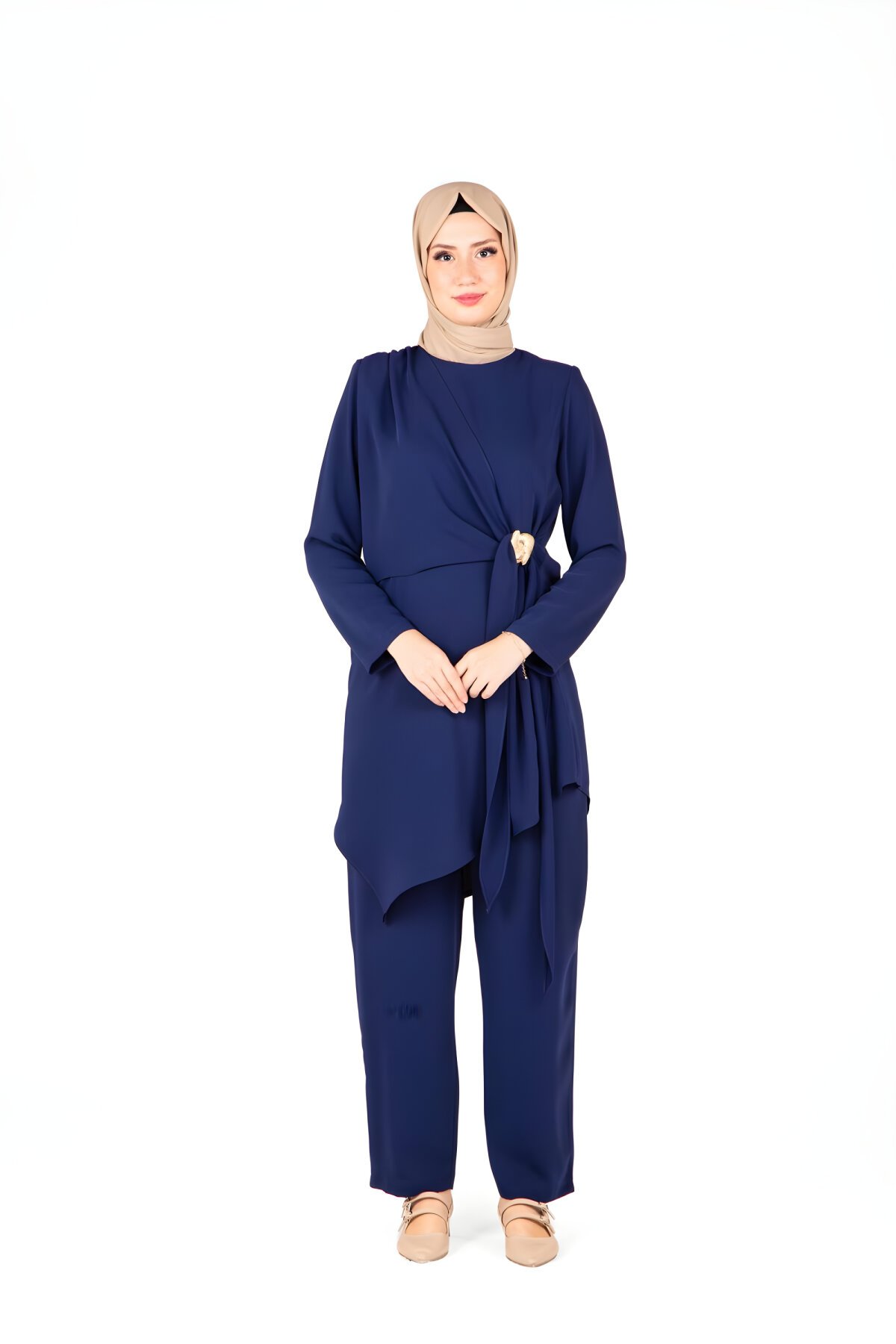 BeyzaBel Kısmı Aksesuar Detaylı Lacivert Tunik Pantolon Tesettür İkili Takım