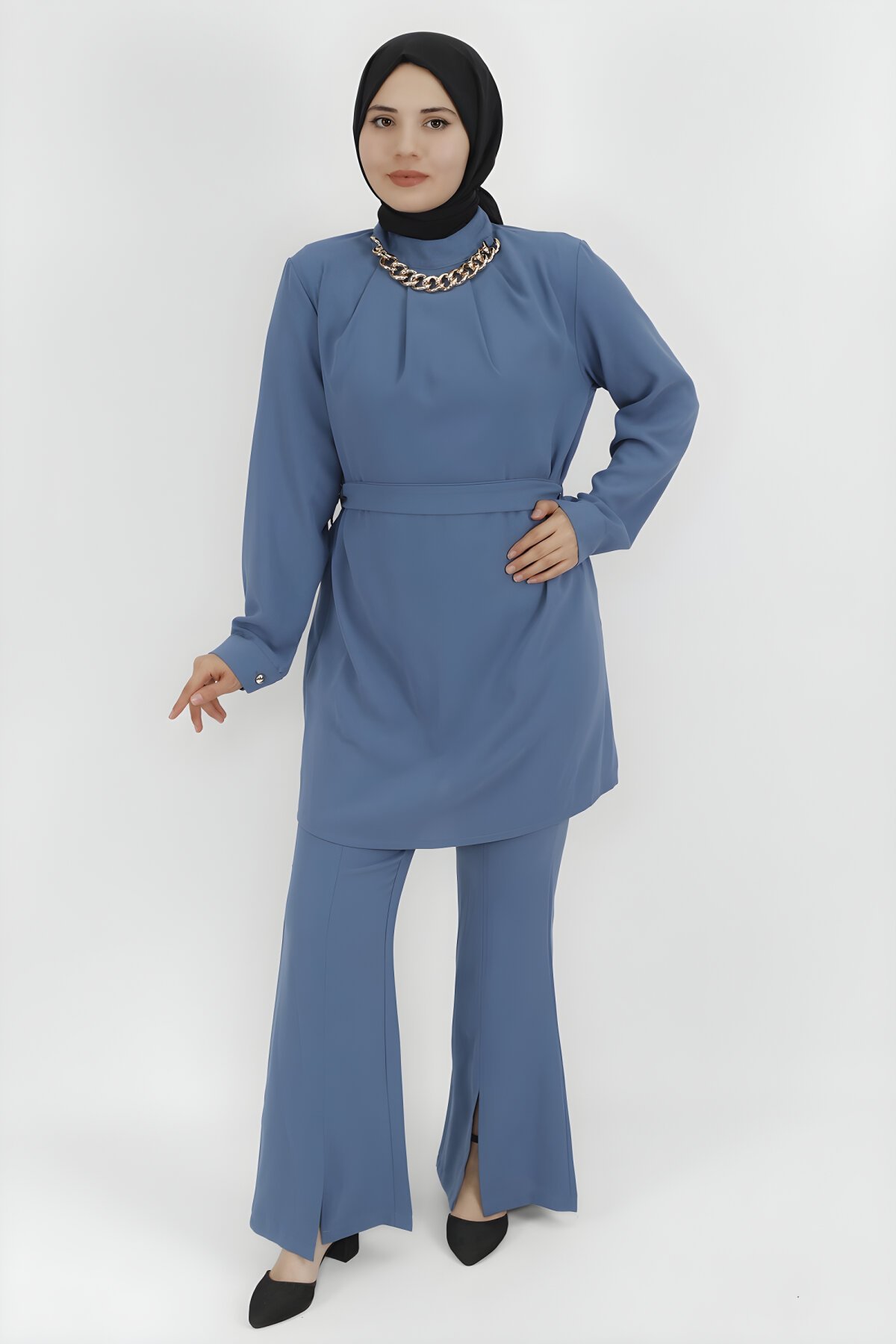 ButikYaka Zincir Detaylı İndigo Scuba Krep İkili Tesettür Takım