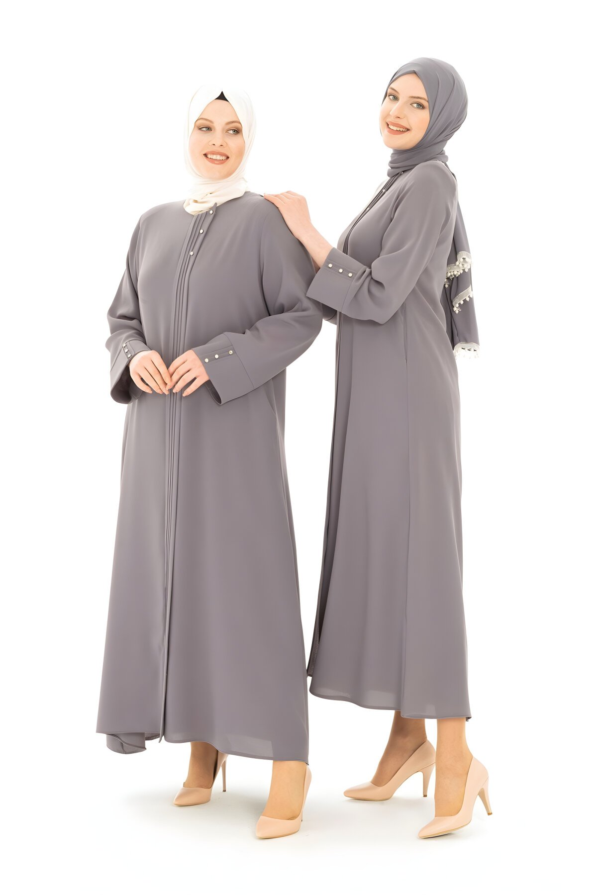 Astarsız, ön tarafı gizli fermuarlı, taşlı çıtçıt aksesuarlara sahip, önde ve kollarında nervür detayları bulunan, kum krep kumaşa sahip gri ferace. Esnek yapısı sayesinde kırışmaya dayanıklı, yumuşak dokulu, iç göstermez. Nefes alan ve ağırlık yapmayan kumaş özelliği ile sık kullanıma uygundur.