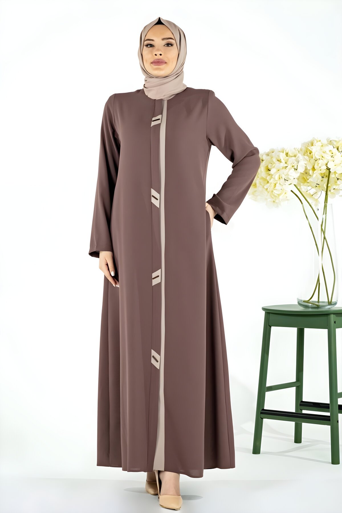 Astarsız, önü patlı fermuarlı, pat kısmı kontrast renk garni detaylı, dikme boncuk süslemeli kahve ferace. Esnek yapısı sayesinde kırışmaya dayanıklı, yumuşak dokulu, iç göstermez, Nefes Alan ve Ağırlık yapmayan kumaş özelliği ile sık kullanıma uygundur.