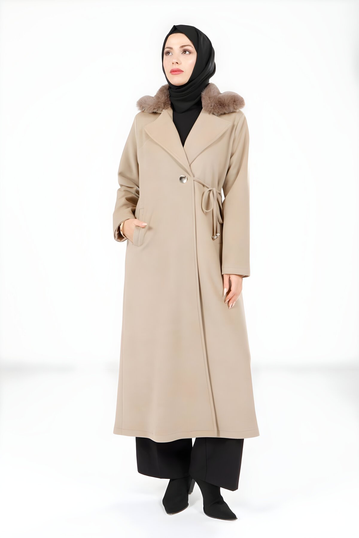 BeyzaYakası Kürklü ve Yandan Bağlama Detaylı Bej Tesettür Kaban