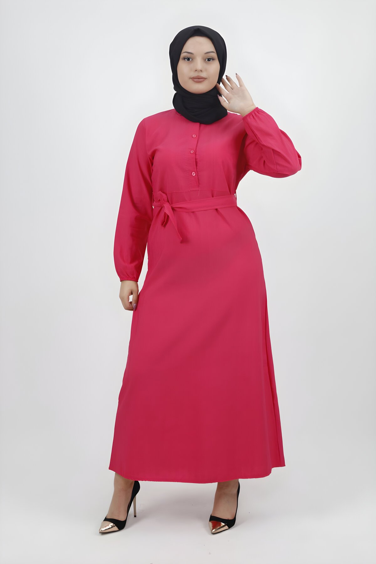 Bwest Fuşya Keten Kumaş Kemerli Düğmeli Tesettür Elbise