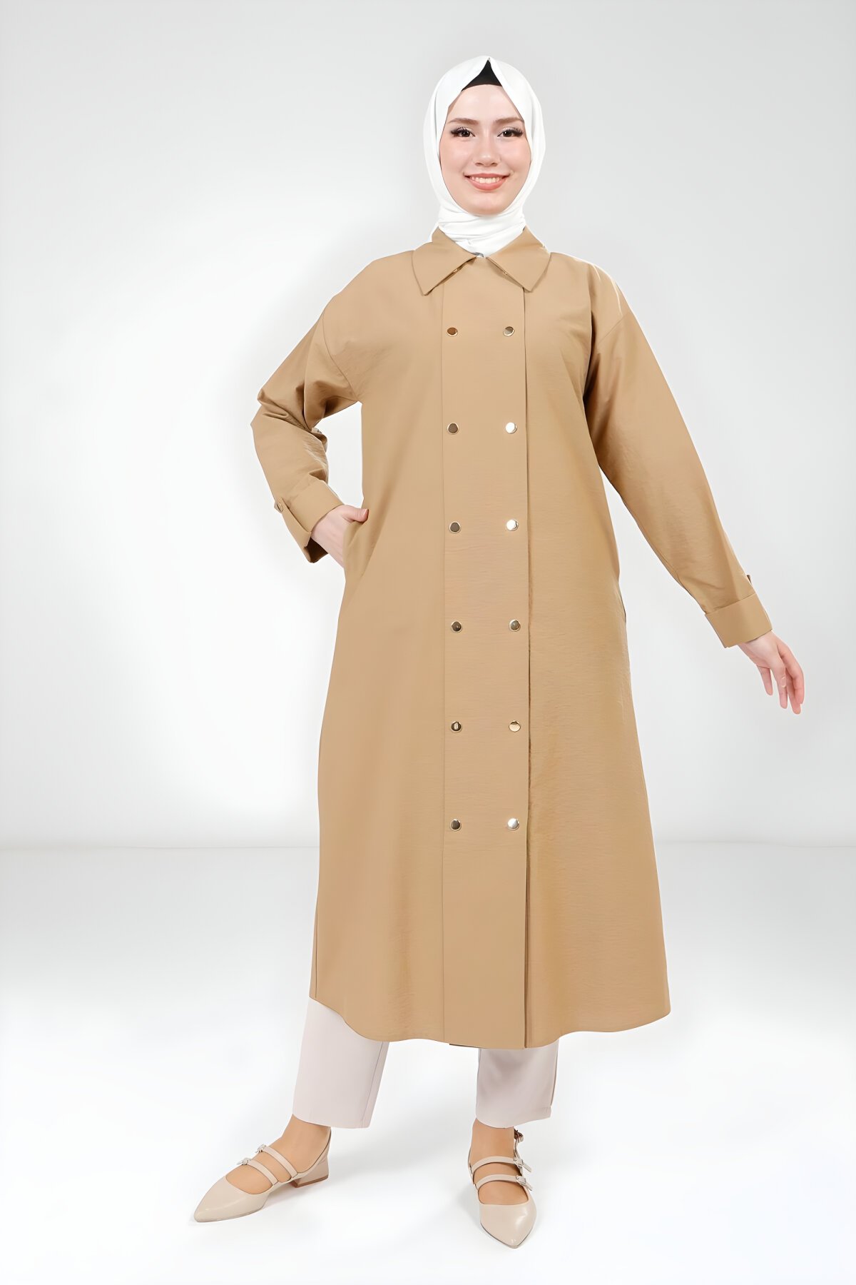 Beyza markasının en yeni Camel renkli düğmeli giy çık kap ve pardesü modelleri ile ş ıklığı yakalayın. Gündelik kullanıma uygun bu rahat ve modern tesettür dış giyim ürünü, sade ve zarif bir görünüm sunar. Düğme detayları ile fark yaratan bu kap modeline Devr-i Tesettür güvencesiyle hemen sahip olun.