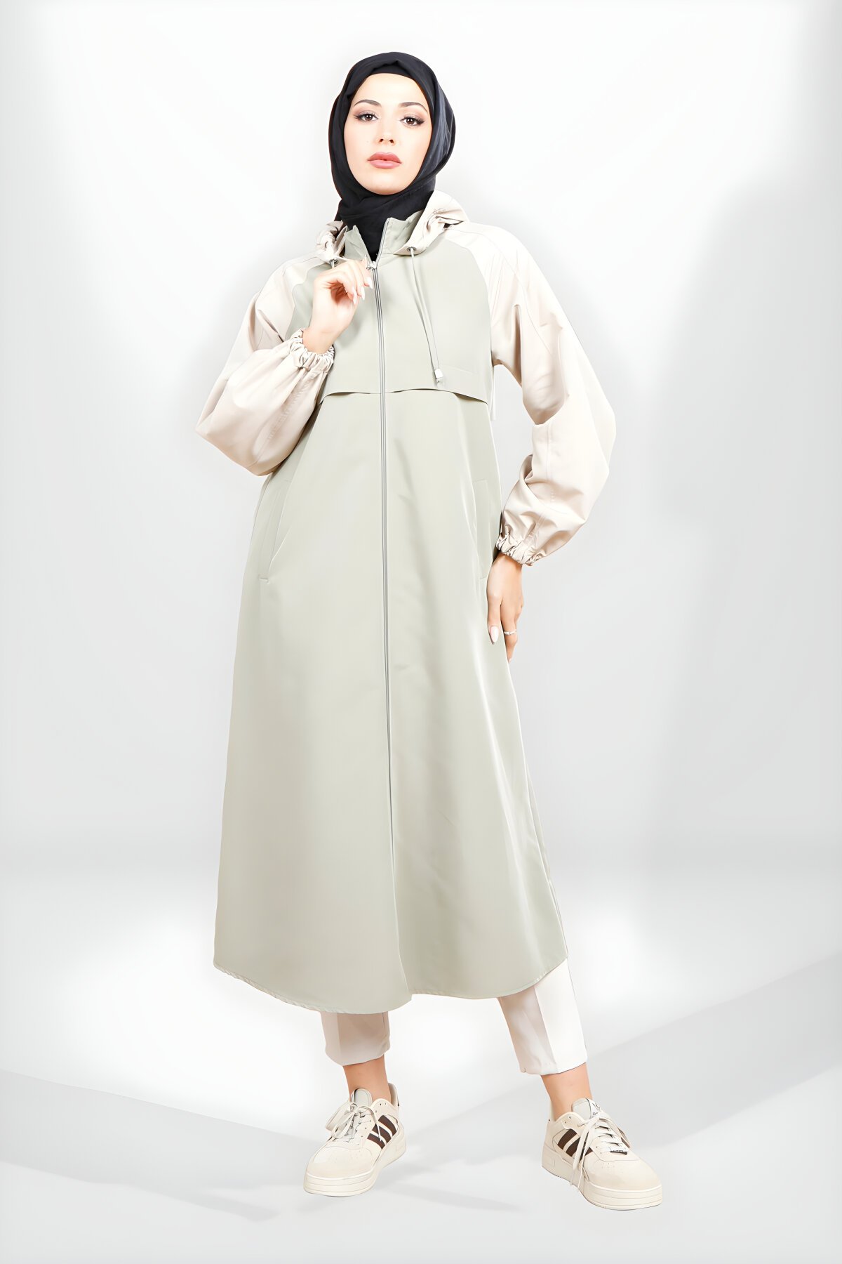 Astarsız, ön bedeni korsaj ve kapşonlu, kol kısımları farklı renkte garni oluşan model ,elcik ,bağ uçlu ve fermuarlı tesettür siyah trençkot.