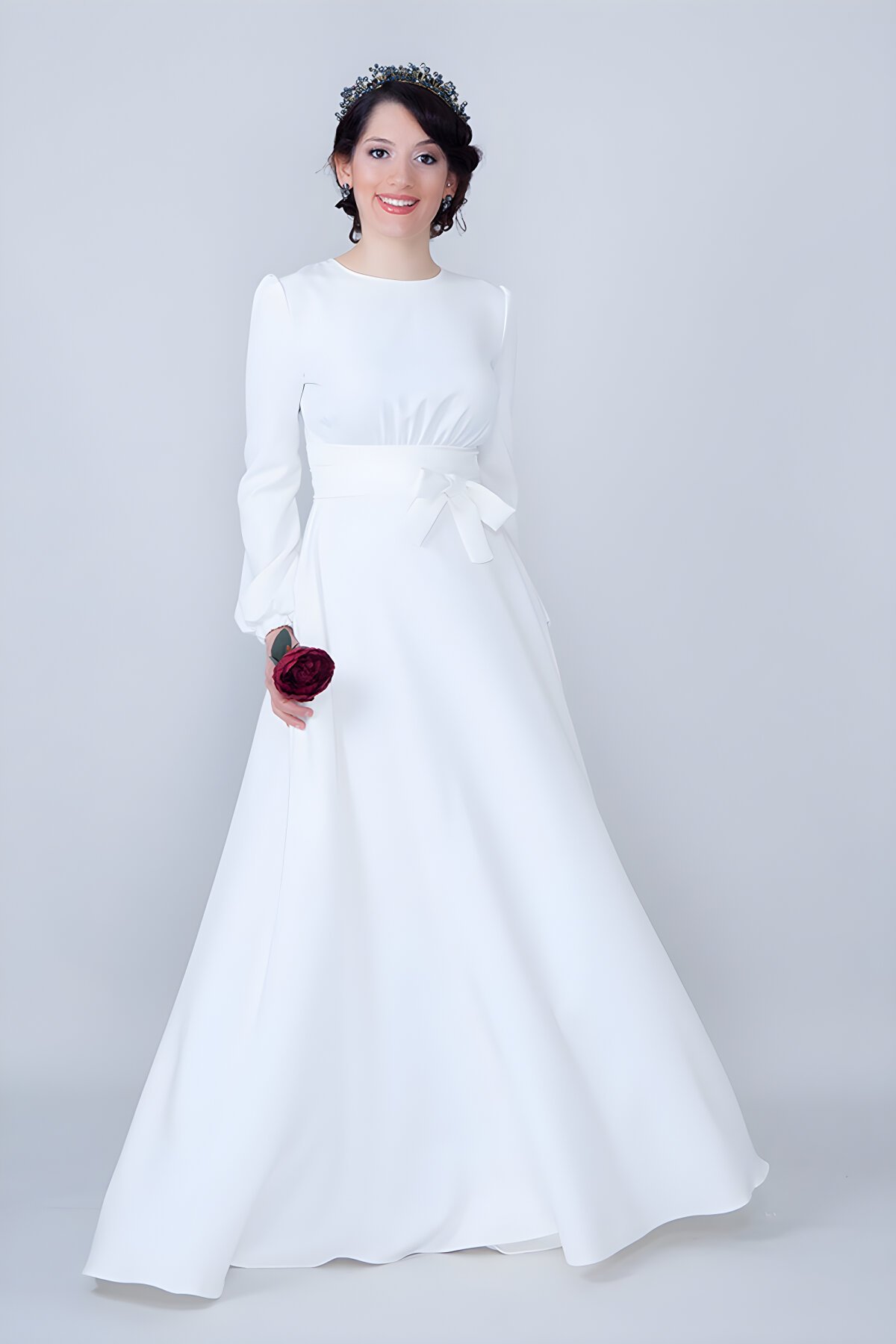 BidoluelbiseKuşaklı Beli Büzgülü Yuvarlak Yaka Uzun Kol Beyaz Tesettür Abiye Elbise