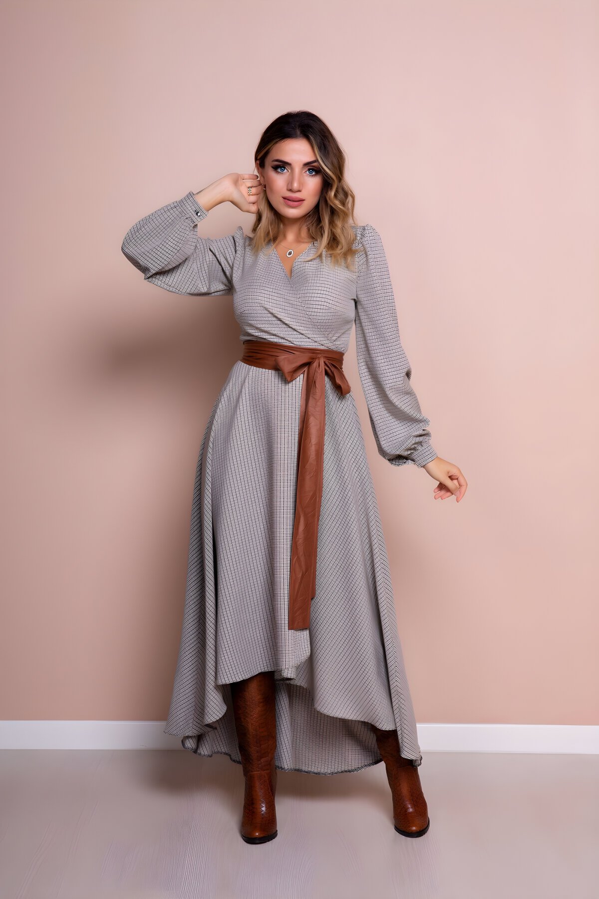 BidoluelbiseTaba Deri Kemerli Vizon Krem Siyah Ekose Asimetrik Kesim Tesettür Elbise