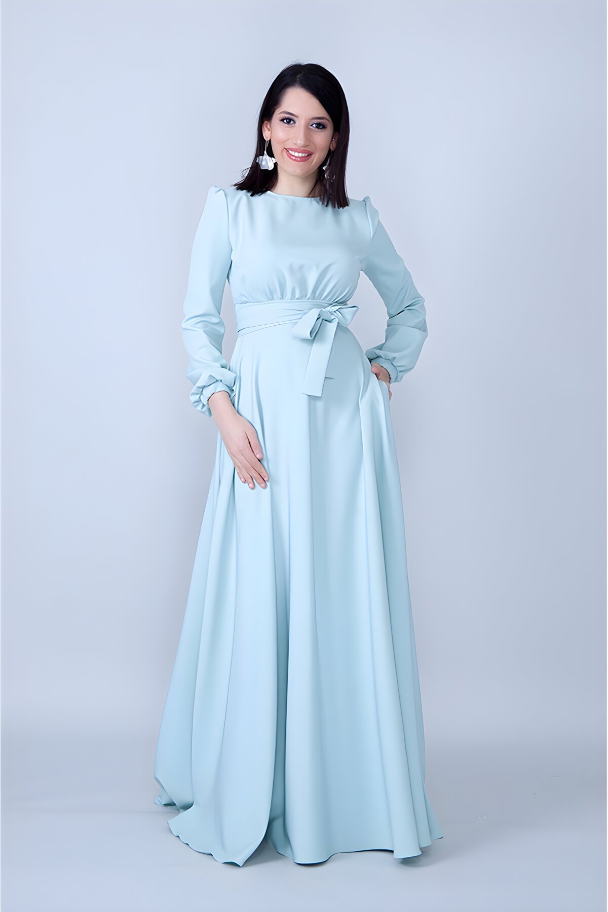 BidoluelbiseMint Yeşili Dokuma Kumaş Beli Büzgülü Kuşaklı Cepli Tesettür Abiye Elbise