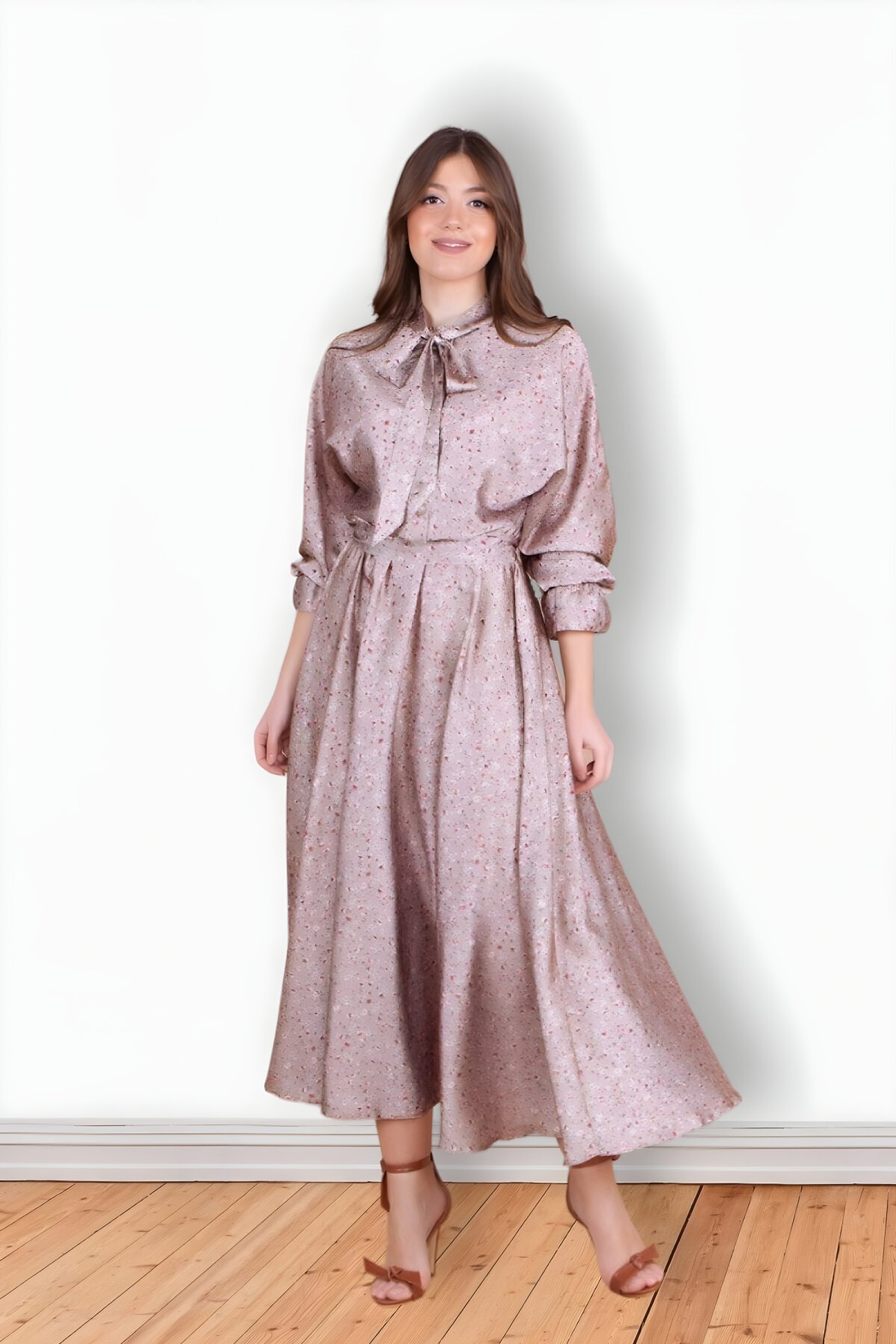 BidoluelbiseBej Çiçek Desenli Yarasa Kol Saten Tesettür Abiye Elbise