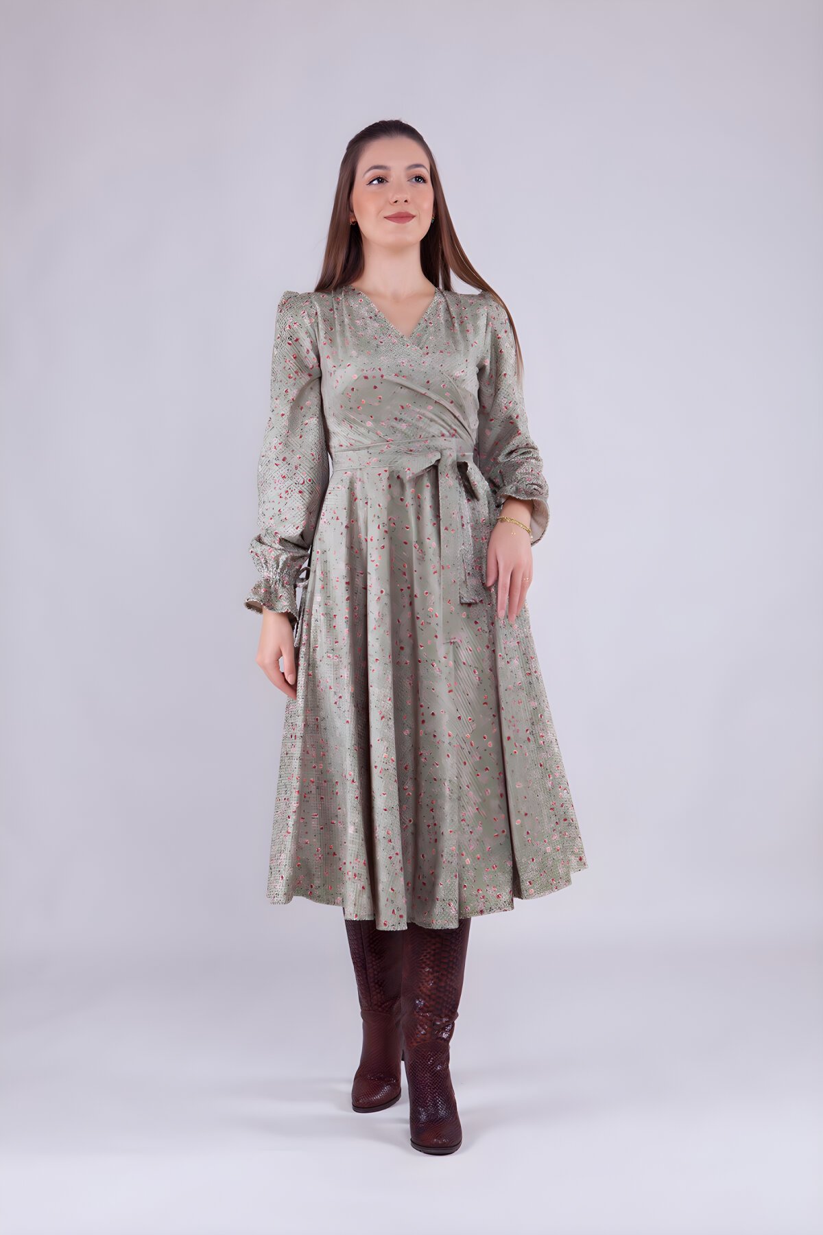 BidoluelbiseKadife Kumaş Mint Çiçek Desenli Kruvaze Yaka Uzun Kol Tesettür Elbise
