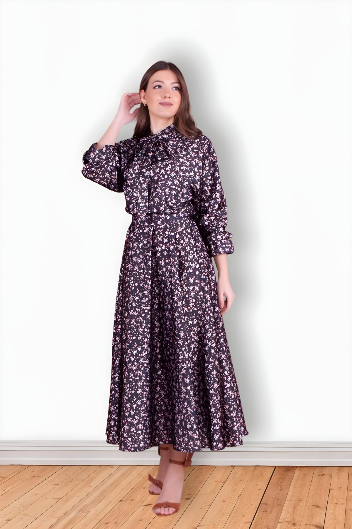 Bidoluelbise Siyah Çiçek Desenli Yarasa Kol Saten Tesettür Abiye Elbise