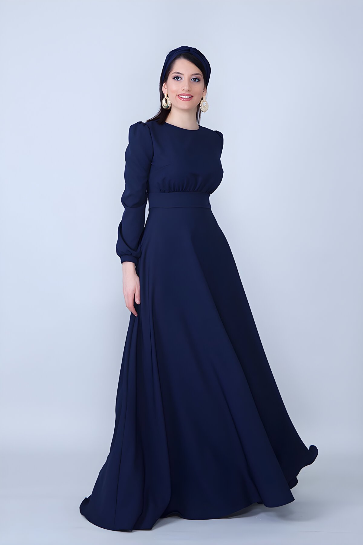 BidoluelbiseLacivert Yuvarlak Yaka Uzun Kol Beli Büzgülü Kuşak Detaylı Tesettür Abiye Elbise