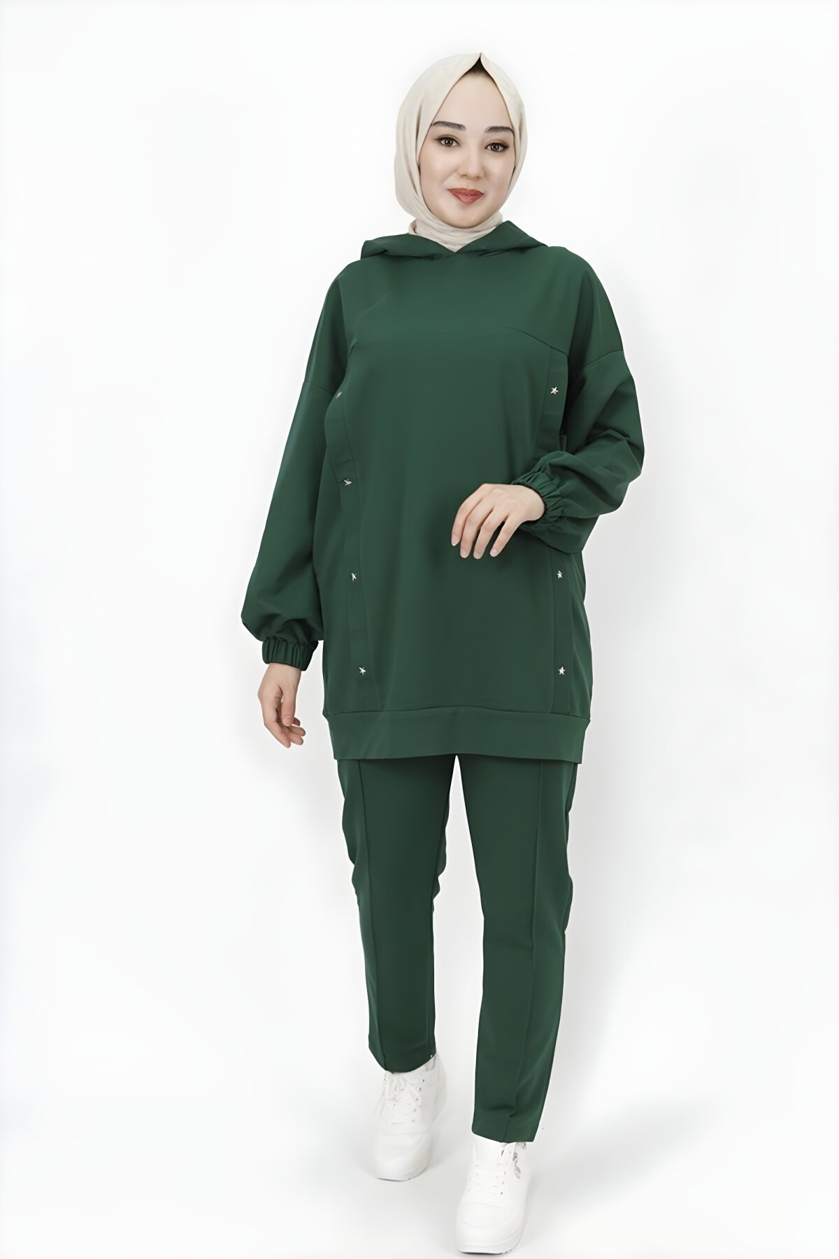 ButikKapüşonlu Haki İki İp Kumaş Yıldız Zımba Detaylı İkili Tesettür Takım