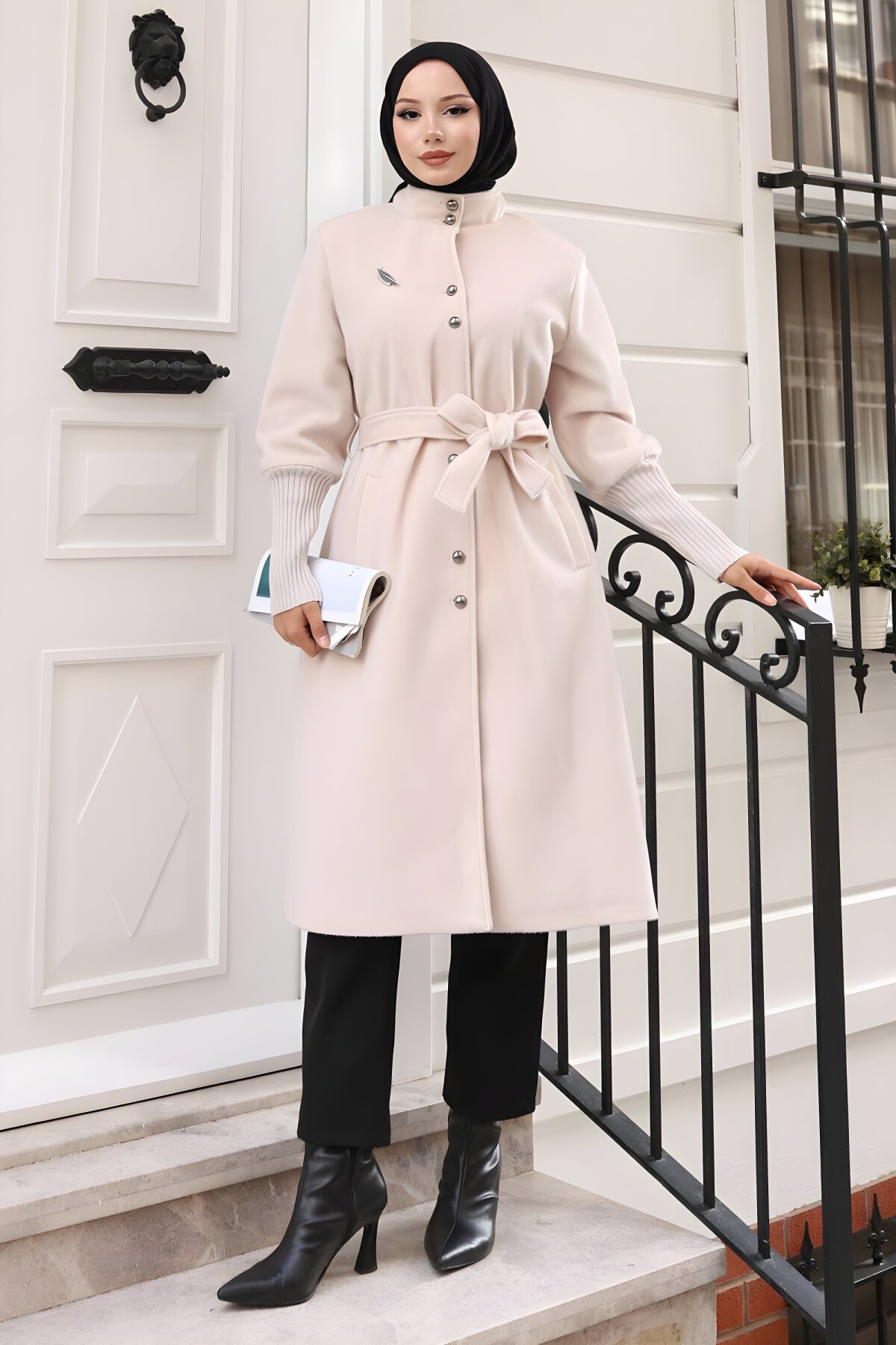 ModamihramBej Broş Detaylı Tesettür Kaban