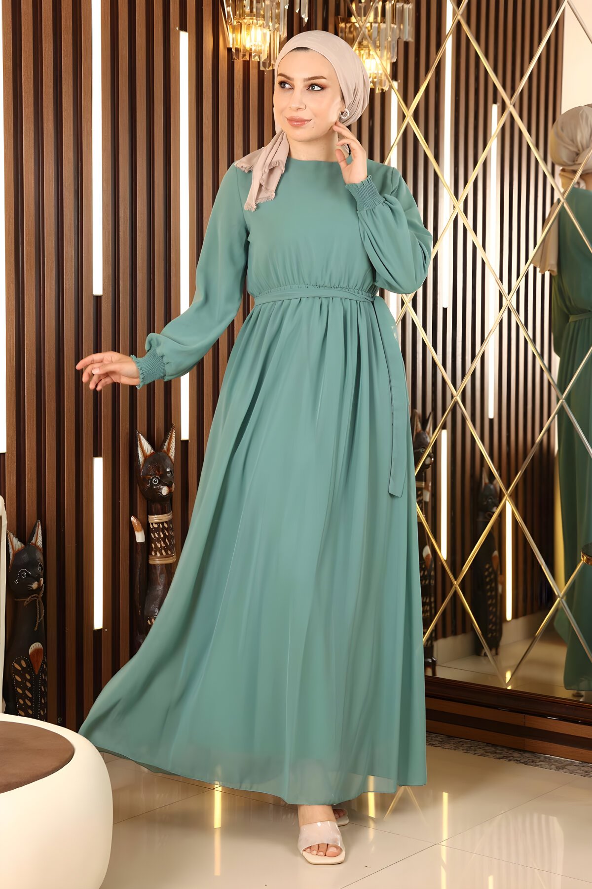 ModamihramMint Şifon Lastik Manşet Detaylı Tesettür Abiye Elbise