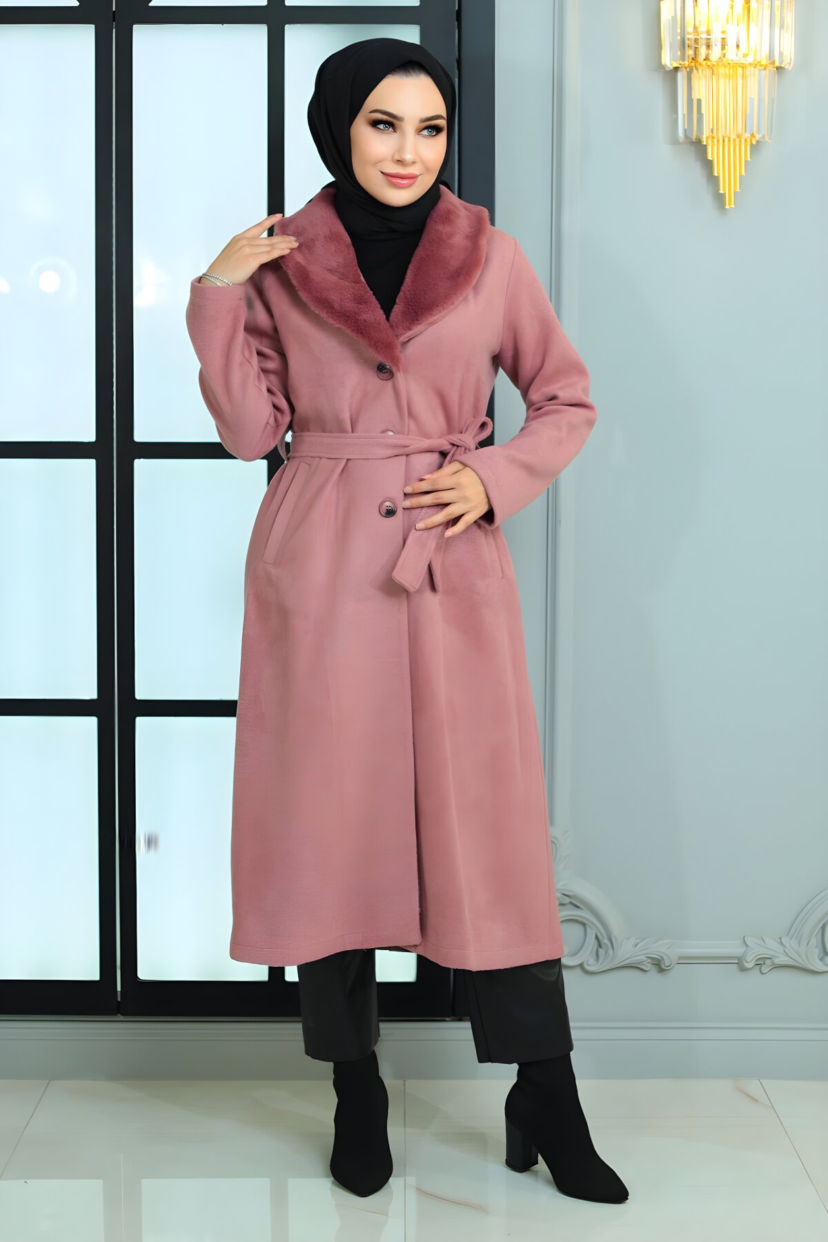 ModamihramGeniş Kürk Yakalı Gül Kurusu Kaşe Tesettür Kaban