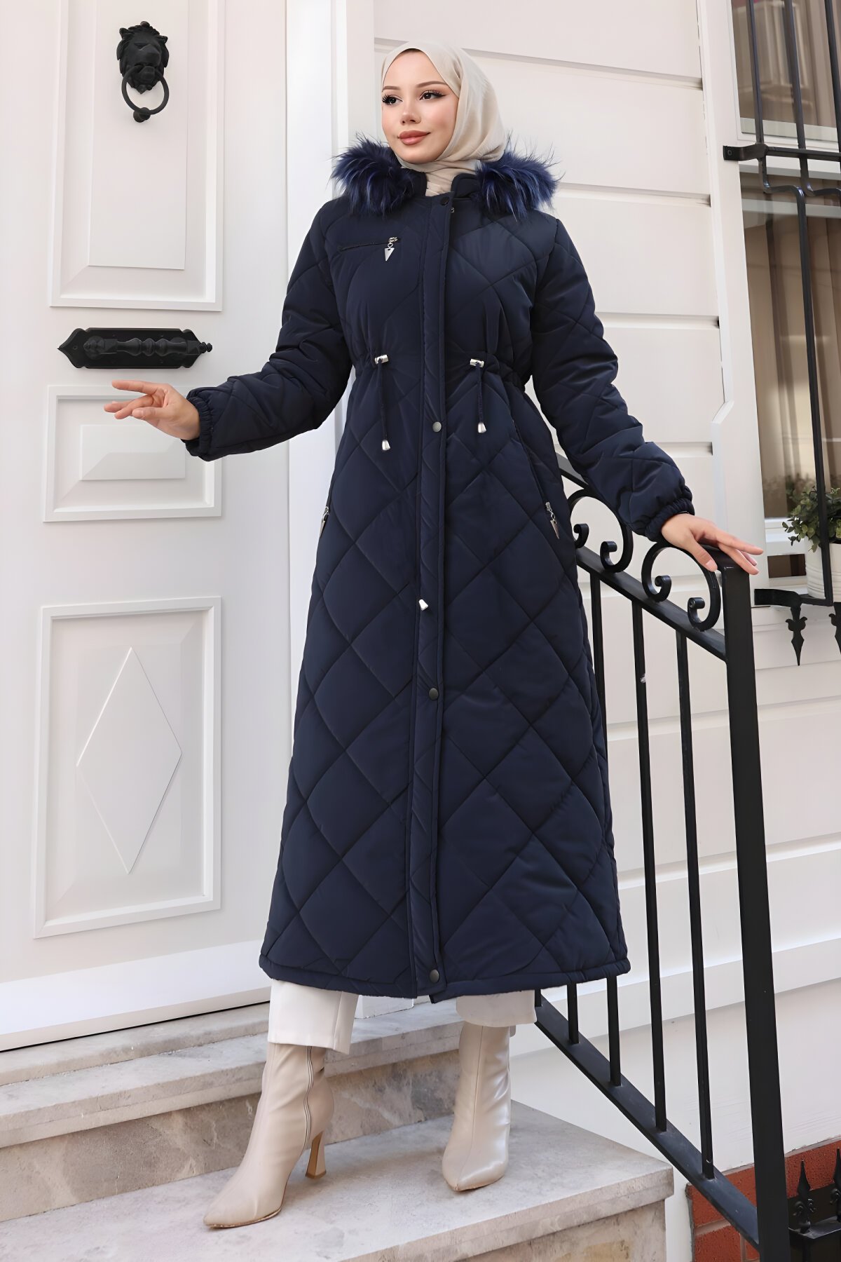 ModamihramKapşonlu Fermuarlı Lacivert Kapitone Tesettür Mont