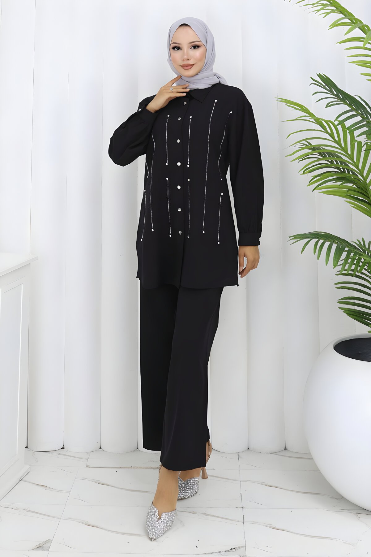 ModamihramTaş Detaylı Siyah İkili Tesettür Takım