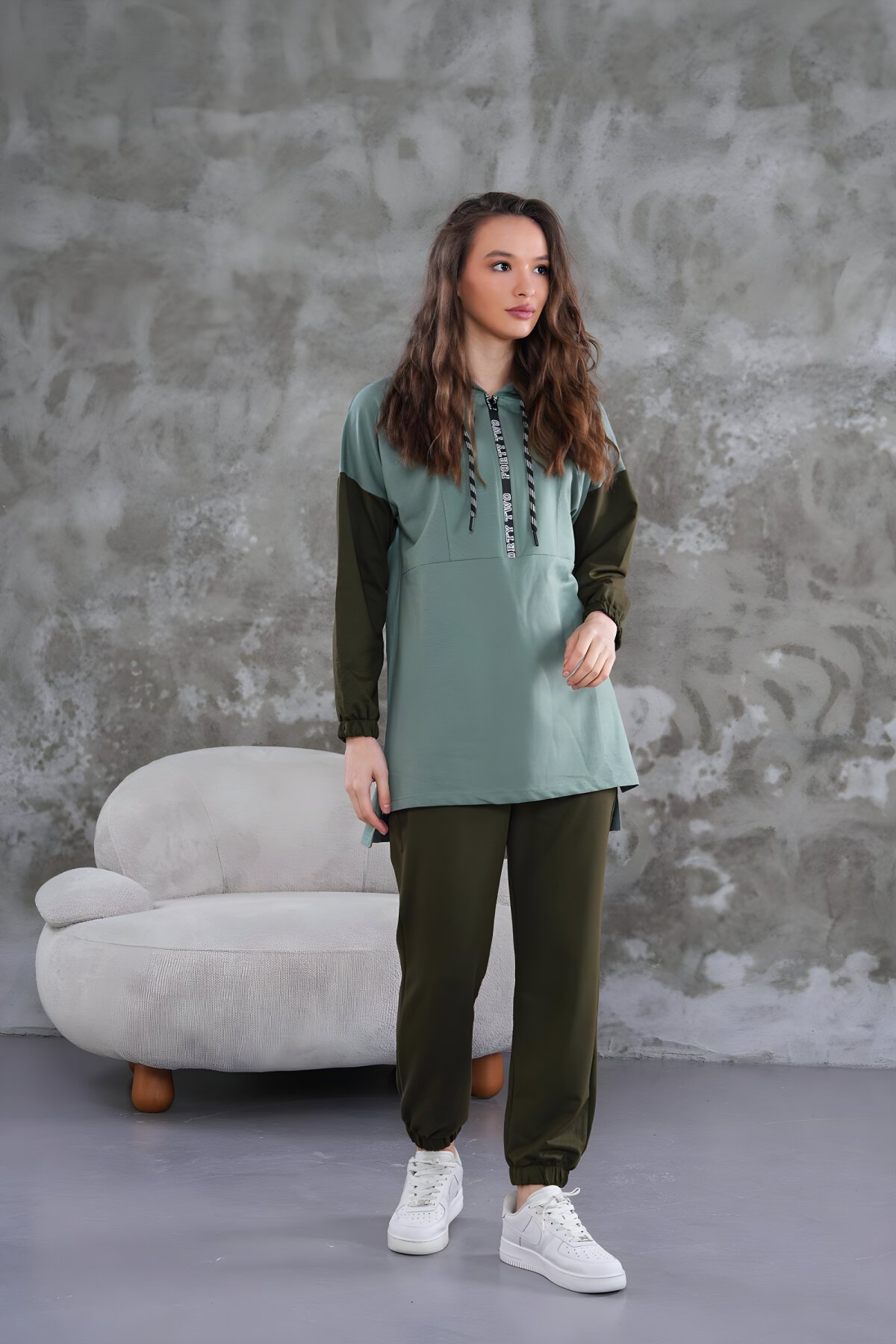 Mint ve Haki Renklerden oluşmaktadır.Eşofman Takım Üst Boy: Ön 75 - Arka 80 cmYarım germuarlıdır.Yüksek kalite özel üretim kumaşlardan imal edilmiştir.Kapüşonludur.Tesettür giyim tercihlerinize uygun boyda üretilmiştir.Günlük spor giyim severlerin severek kullanabileceği esnek ve yumuşak kumaşlardır.Manken Boy 1,70 cm olup üzerindeki ürün M bedendir.Normal kalıptır. Bedeninze göre seçim yapabilirsiniz.50-55 Kg - S beden