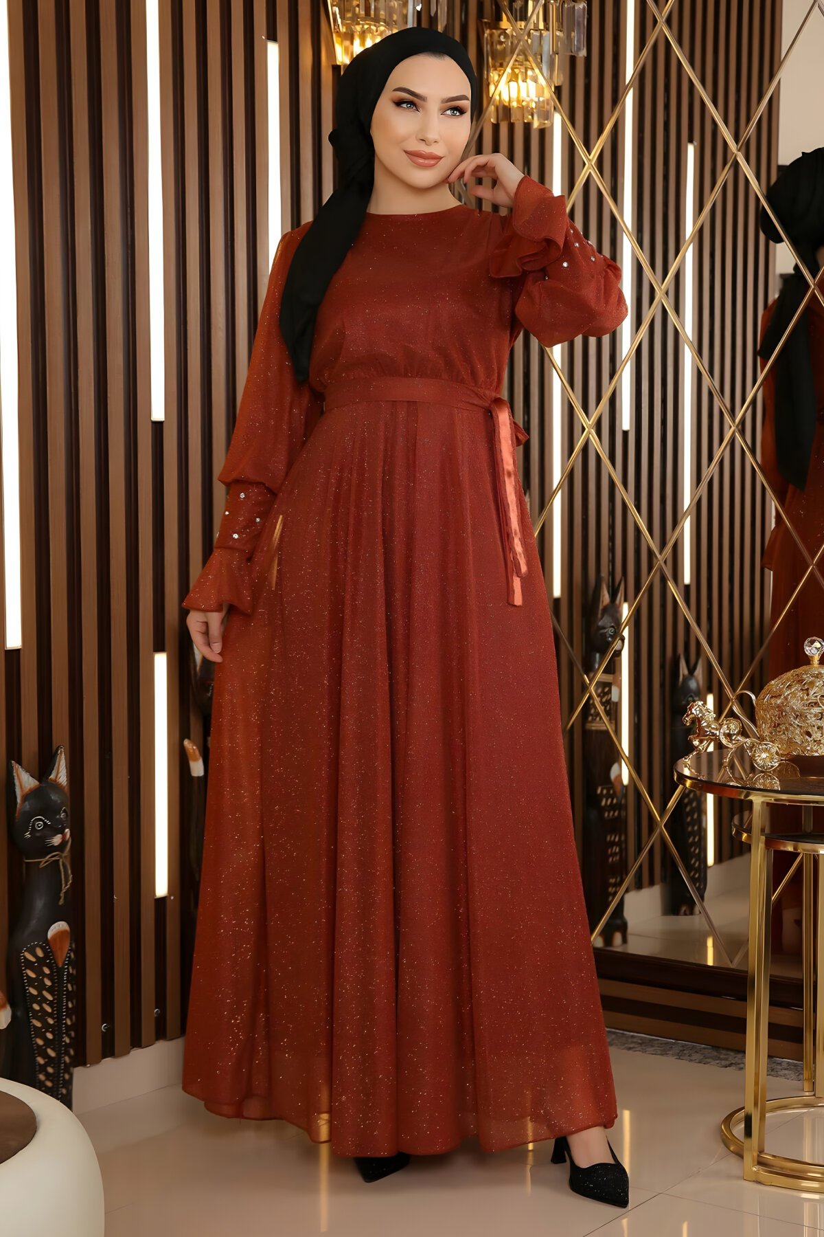 ModamihramKiremit Taş Detaylı Simli Şifon Tesettür Abiye Elbise