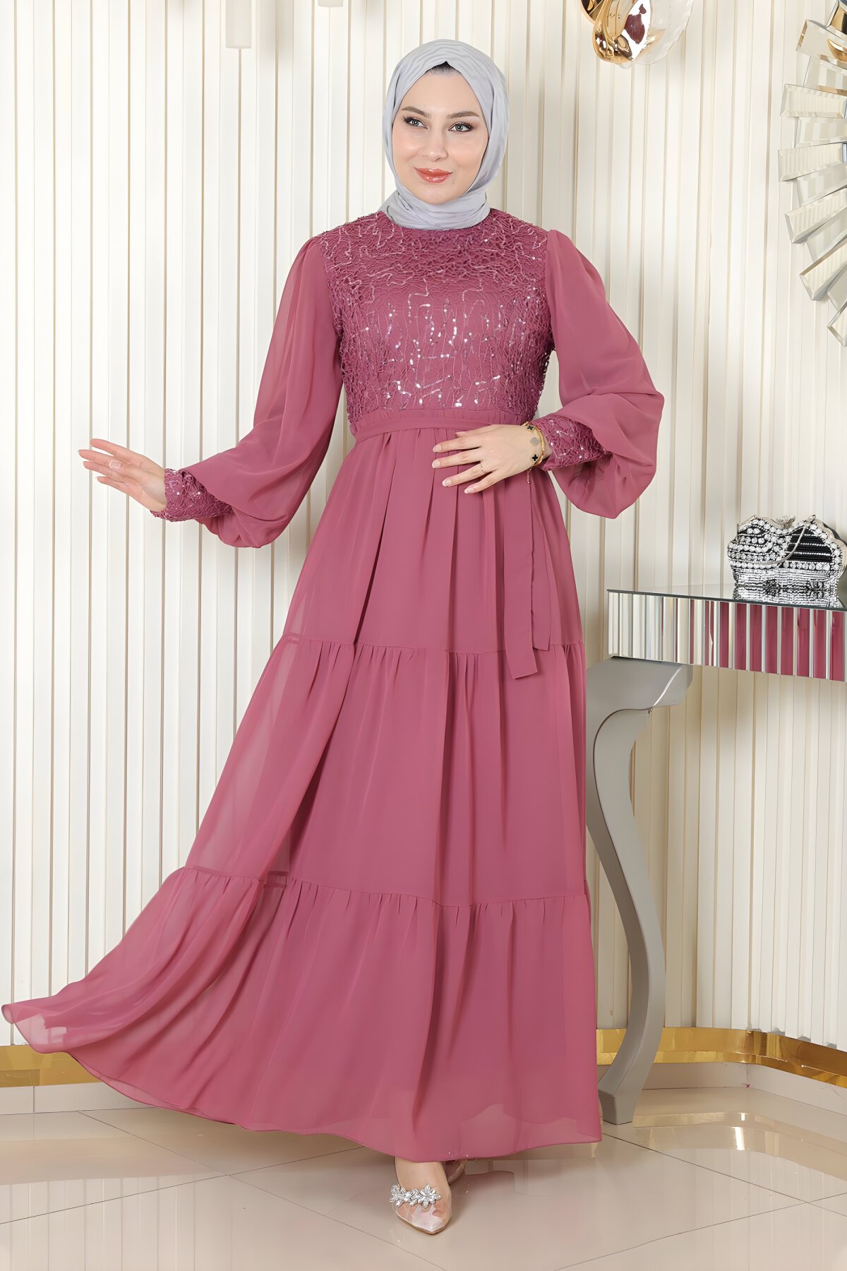 ModamihramPulpayetli Şifon Gül Kurusu Tesettür Abiye Elbise