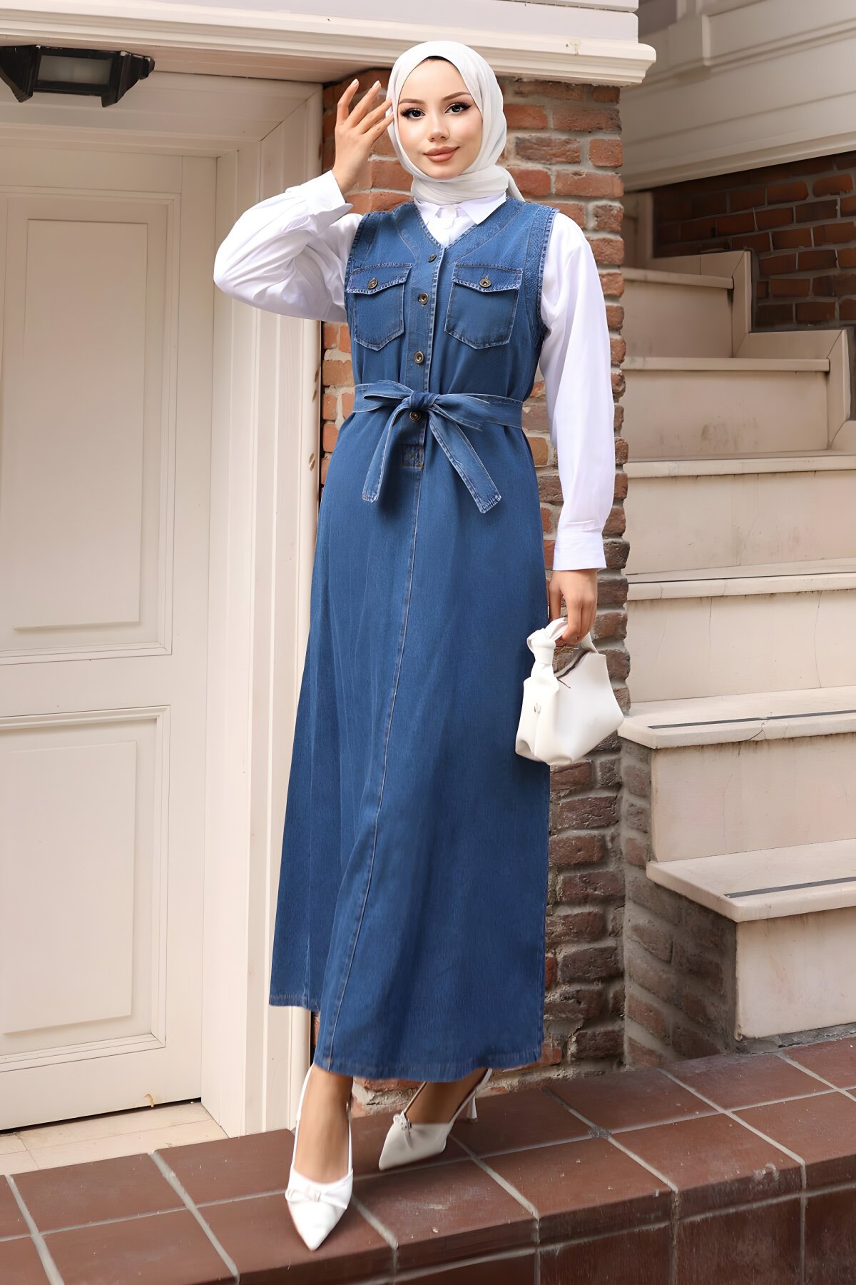 Modamihram’ın bu açık mavi kot jilesi, klasik denim dokusunu modern ve muhafazakar bir estetikle kusursuz bir şekilde buluşturuyor. V yaka kesimi ve boydan düğmeli yapısıyla hem zarif bir duruş sergiliyor hem de günlük kombinlerinize dinamik bir hava katıyor.
