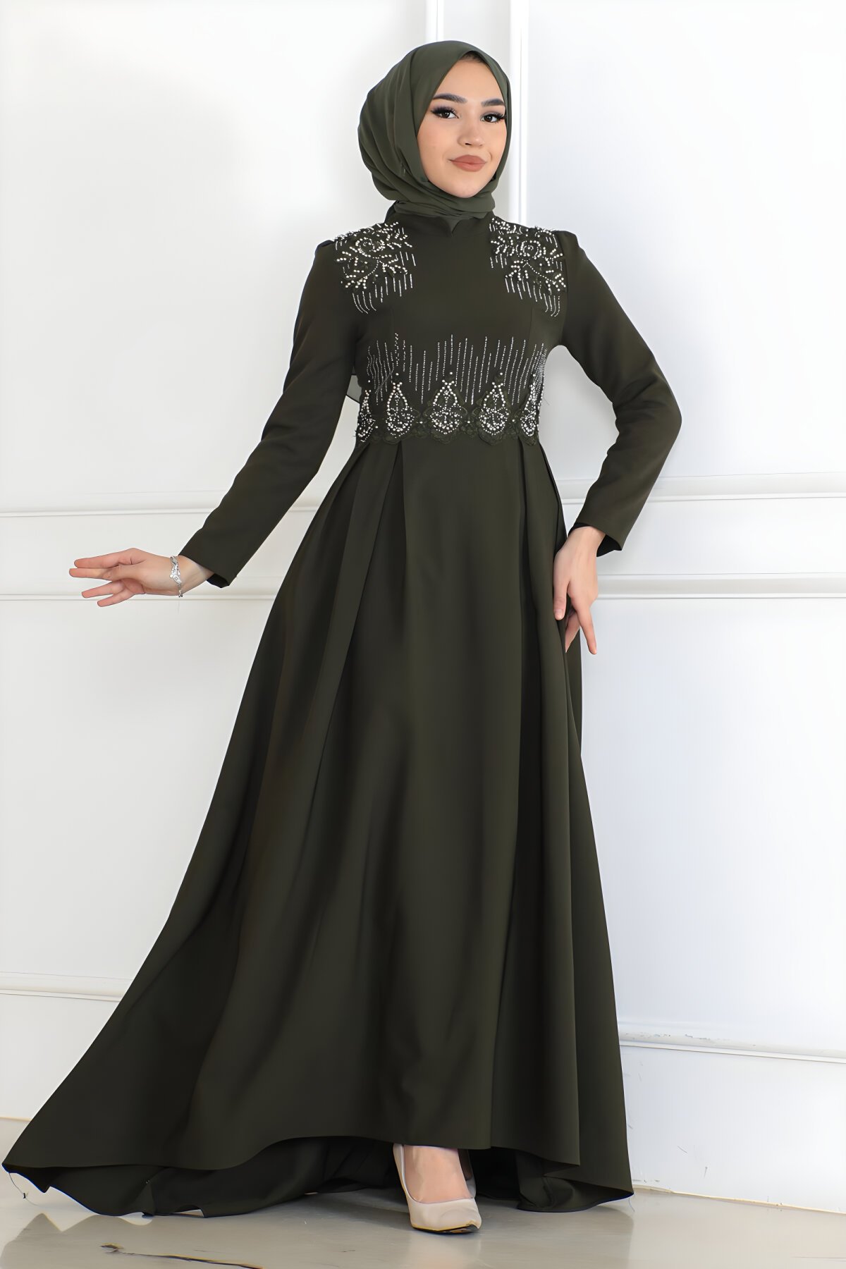 Modamihram markasının en zarif tasarımlarından biri olan Haki İnci Detaylı Tesettür Abiye Elbise ile özel davetlerde tüm dikkatleri üzerinize çekin. Bu uzun, şık ve inci işlemeli elbise, zarafeti ve tesettür çizgisini bir araya getiriyor. Benzersiz abiye modellerini Devr-i Tesettür güvencesiyle hemen keşfedin.