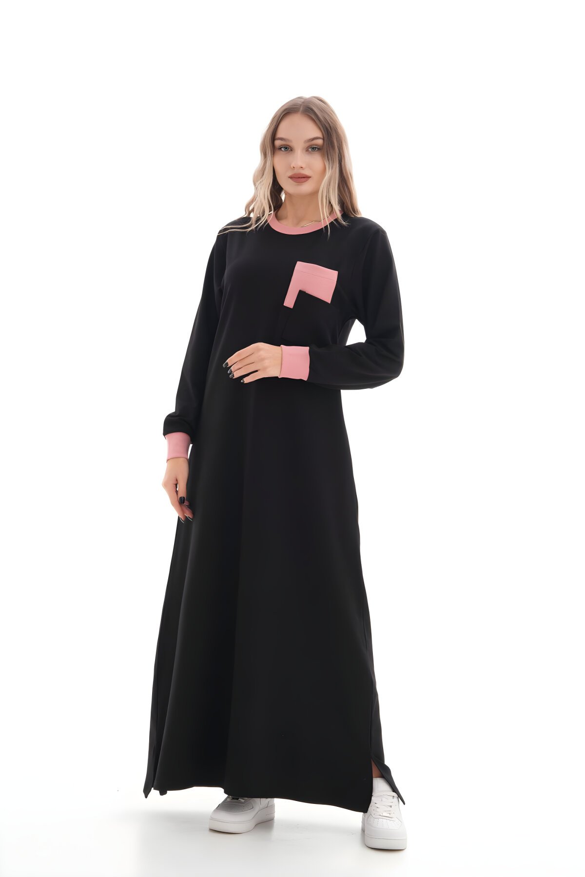 Westbound markasının bu özel tasarımı, siyahın asaletini pudra pembesinin yumuşak dokunuşlarıyla birleştirerek tesettür giyimde modern bir soluk sunuyor. İki iplik kumaşın sağladığı konfor, gün boyu hem şık hem de rahat hissetmenizi sağlayan uzun ve akışkan bir silüetle buluşuyor.
