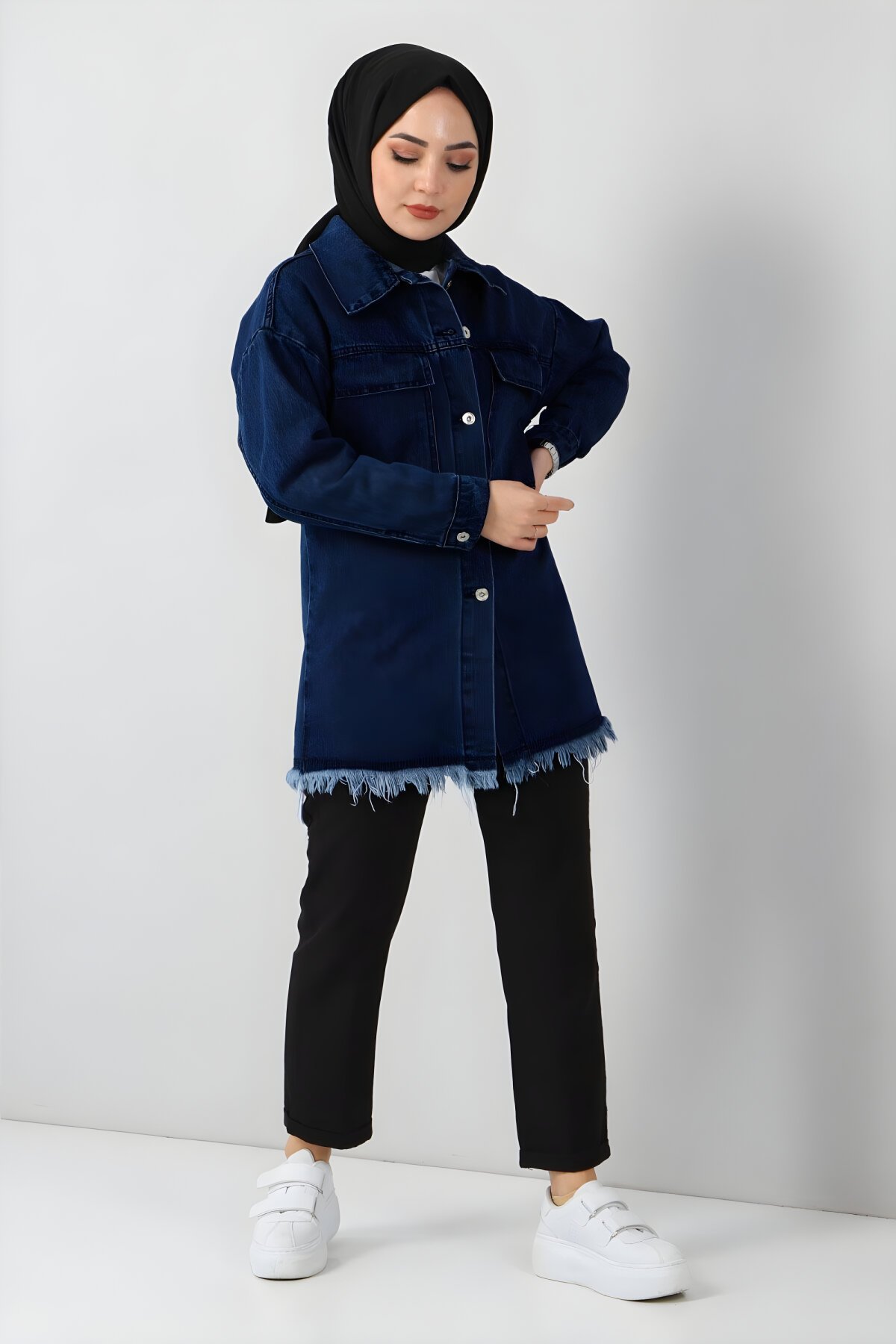 Modamihram markasına ait bu şık lacivert püskül detaylı kot ceket, tesettür giyim kombinlerinizin vazgeçilmezi olacak. Kaliteli denim kumaşı ve özel püskül detayları ile tarzınızı tamamlayın. Devr-i Tesettür güvencesiyle hemen sipariş verin.