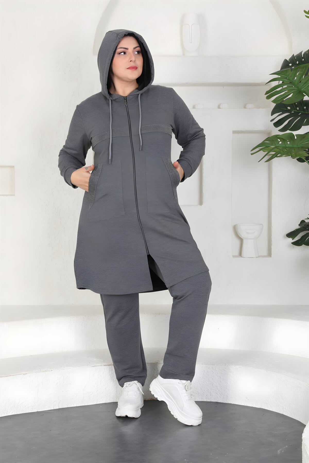 Taş Baskılı Kadın Büyük Beden Eşofman Takımı - Gri